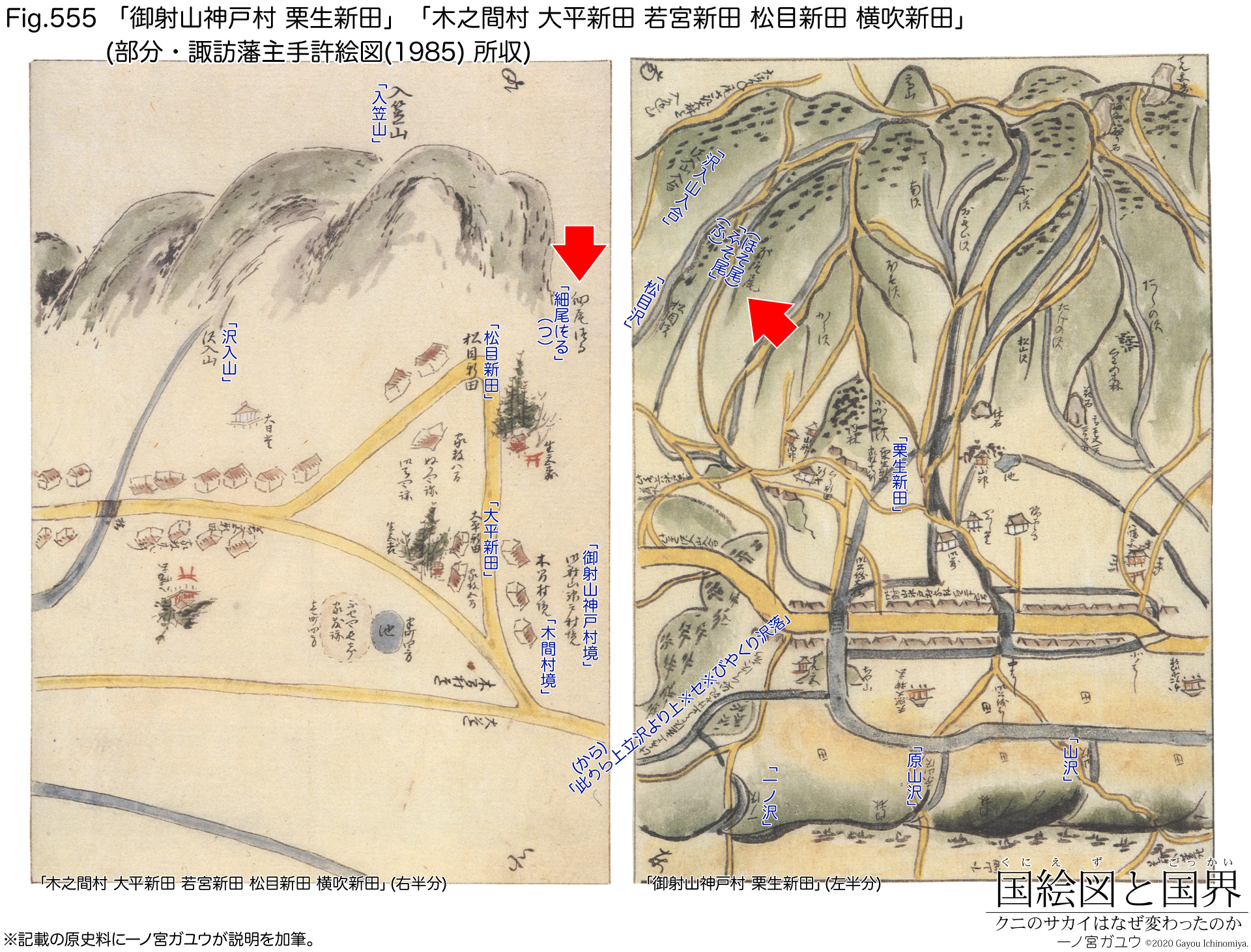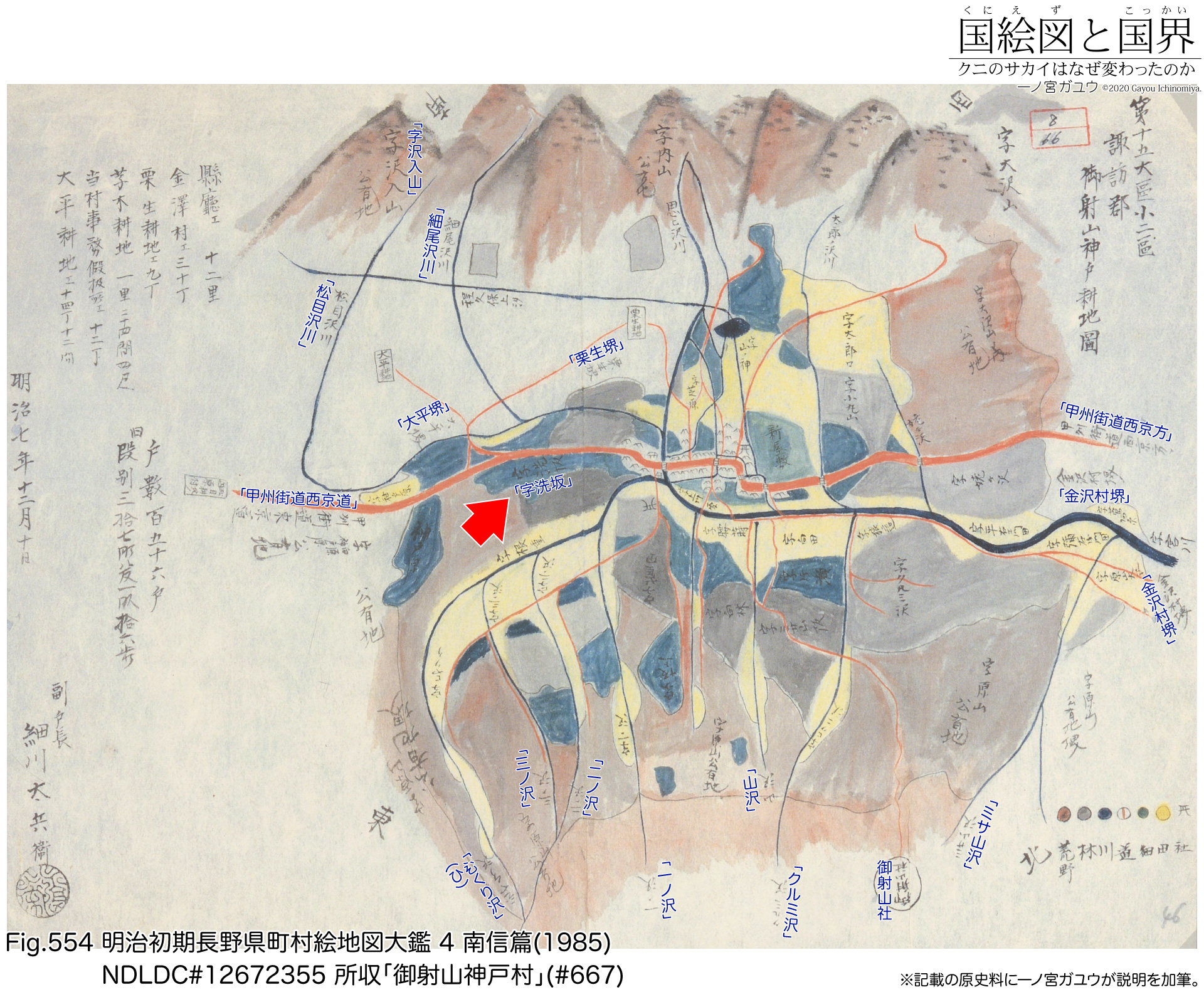 | 『諏訪史蹟要項 8 富士見村篇』(1955/1996) | 天文九年堺十八ケ村が諏訪領とならざる以前の甲信の境界 a、立場肘曲り―糠塚―神戸あらい坂―麦日向見通シ b、立場肘典り―栗生の細尾迄 |