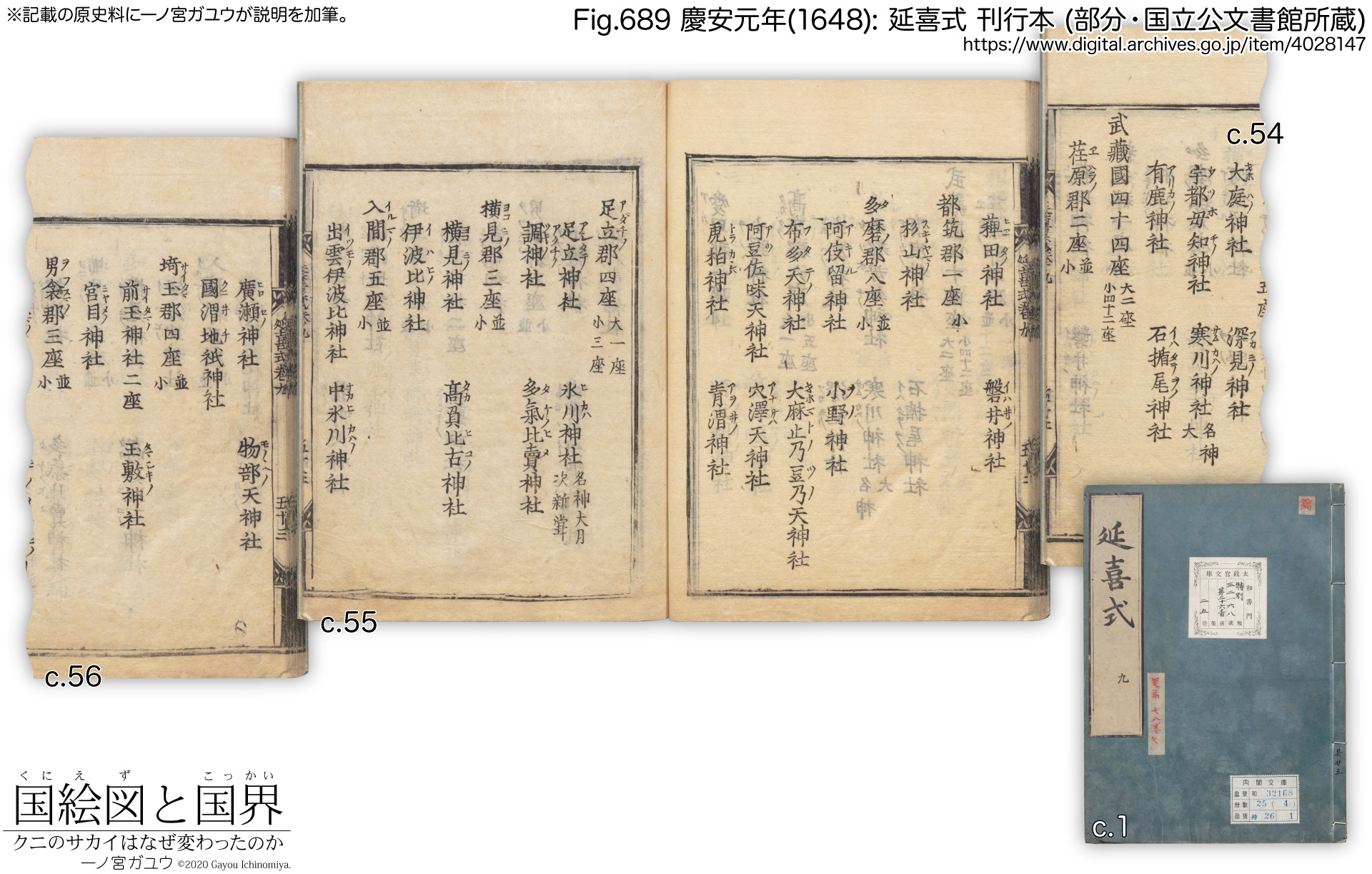 『延喜式』は養老律令に対する「式」(施行細則) を集大成した古代の法典である。延喜5年(905) に編纂をはじめ、延長5年(927) に成立した。先行する「弘仁式」「貞観式」を基に、その後の法令を網羅的に集成したものであり、特に巻9・巻10は、律令制下の神社 (官社) 2861社 (3132座) を国郡ごとに載せ、『延喜式神名帳』ともいい、古代の地名の検討するのに重要な史料となっている。平安末期の写本を東京国立博物館が所蔵、ColBaseで公開されており (#B-2370)、現存するものでは最古である。