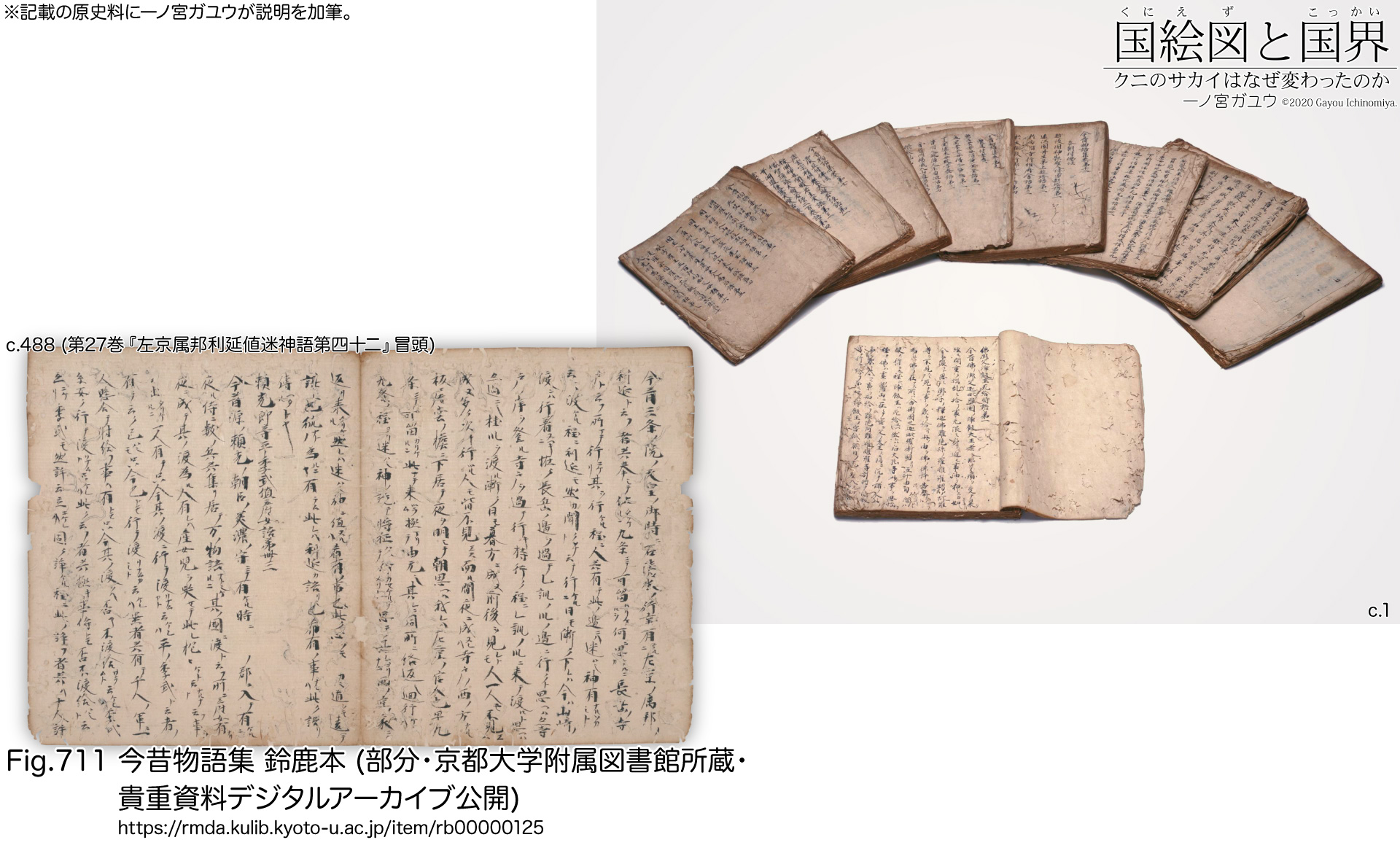 『今昔物語集』は平安末期の説話集、編者は不詳。各説話が「今は昔」ではじまるのでこのように呼ばれる。「天竺」「震旦」「本朝」の 3部に分けて千を超える説話を収録している。全31巻のうち28巻が現存し、京都大学附属図書館所蔵 / 貴重資料デジタルアーカイブ公開 の『鈴鹿本』(#RB00000125) と呼ばれるものが最古の写本で国宝に指定されている。