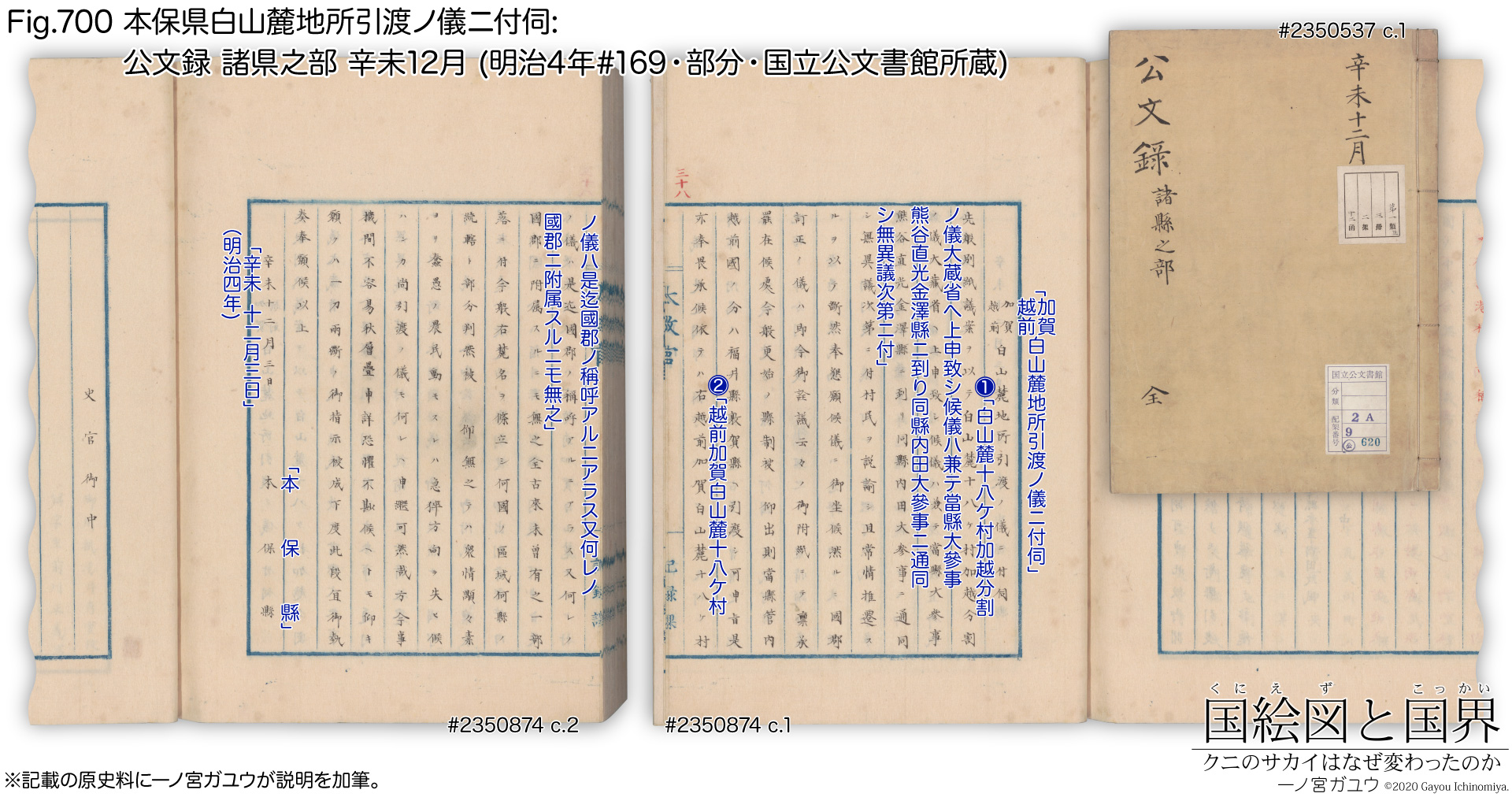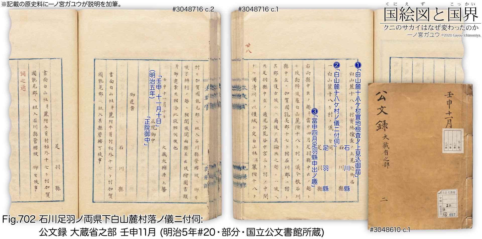 上は『石川足羽ノ両県下白山麓村落ノ儀ニ付伺』 (公文録 大蔵省之部 壬申11月, 明治5年#20; #3048716) の主文にあたる部分で (cc.1-2)、①の石川県の報告書が別紙の 1番目 (cc.3-7, 11)、足羽県の報告書が別紙の 2番目 (cc.8-9, 12) として添付されている。③はすでに引用した『白山麓十八ケ村ノ儀ニ付伺』で、3番目 (cc.13-14) に添付されている。