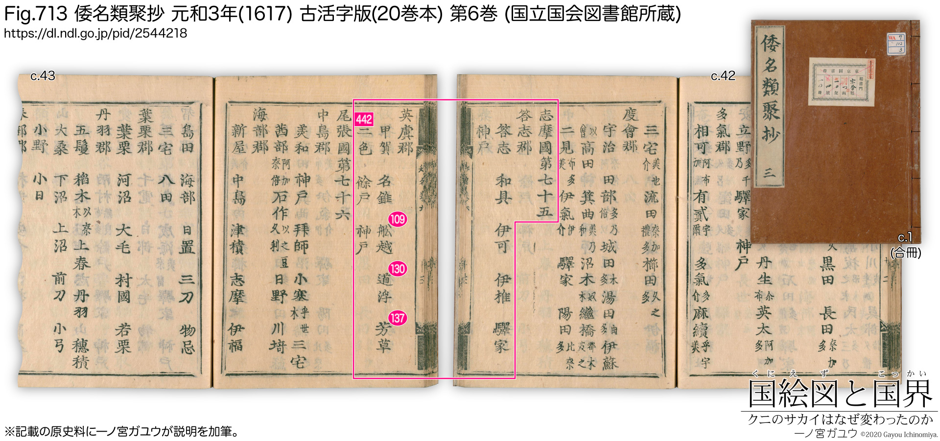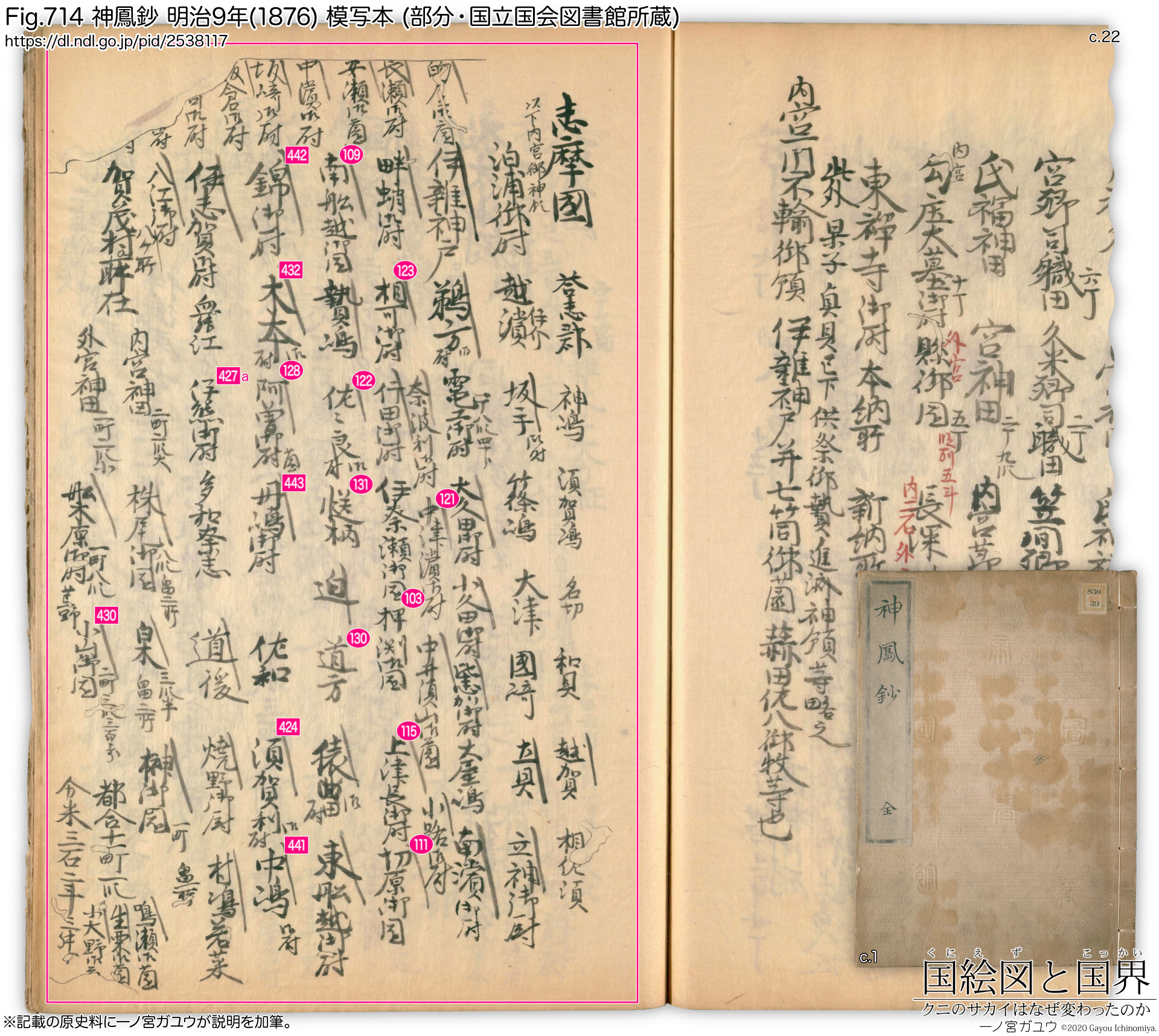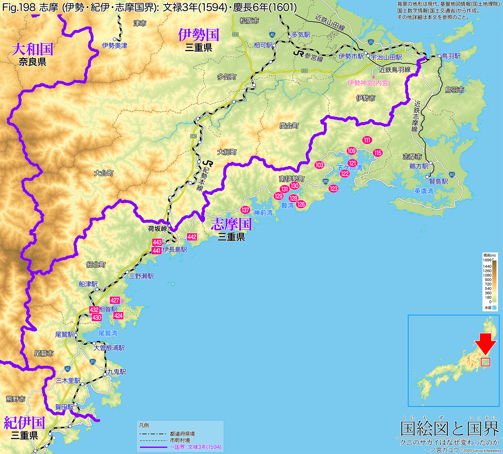 上には古代の志摩国の範囲と、変動した範囲に含まれる『和名類聚抄わみょうるいじゅうしょう』の英虞郡 各郷、および『神じん鳳ぽう鈔しょう』の志摩国 各御厨みくりや・御み薗その (園) にあたる近世の村々を示した (そのほかの史料にあらわれるものについては『23.3. 天保郷帳・国絵図の村々』を参照)。