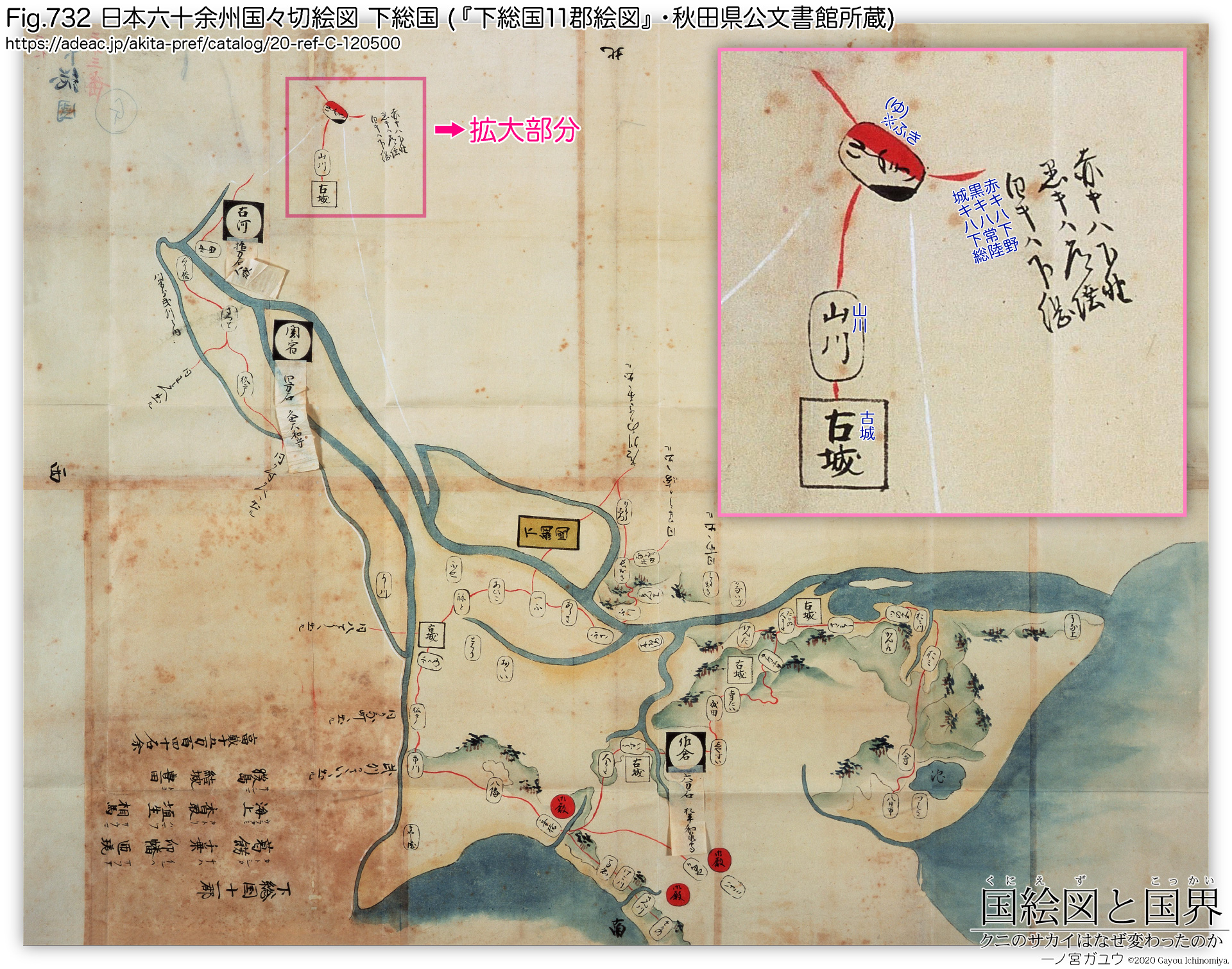 凡例には「赤キハ下野」「黒キハ常陸」「白キハ下総」とあり、本図では結城本郷が 3国で塗り分けられている。これは寛永下総国絵図にあたる『寛永下総国絵図』でも同様である。厳密な意味については、ほかに情報が書かれていないので不用意に断定することは避けたいが、少なくとも結城本郷という町は、下総国であることは確かであるものの (下野国絵図・常陸国絵図にはこのオブジェクトは存在しない)、かなり曖昧な位置づけになっていることは確かである。おそらく高椅を含む周辺地域にも同じことがいえ、それが確定するのが寛永14~15年(1637~1948) の検地だったと推定される。