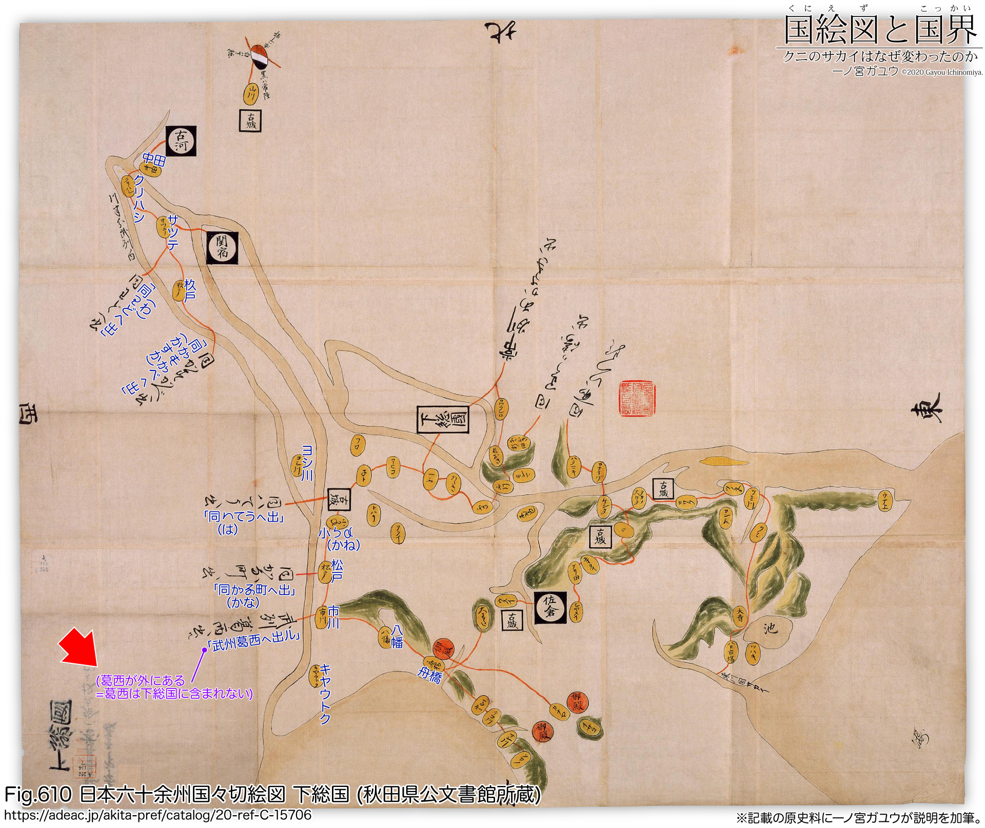 つまり描かれているのは近世の利根川 (現在の江戸川) までであって、葛西地域は下総国の外にある。武蔵国では「同市川ㇸ出」(同 = 下総) とあるところから佐倉街道がはじまり、「𛀚𛂁川」(かな川、金町)※5から来る水戸街道と合流するところに「𛀚さい」(かさい、葛西) がある。