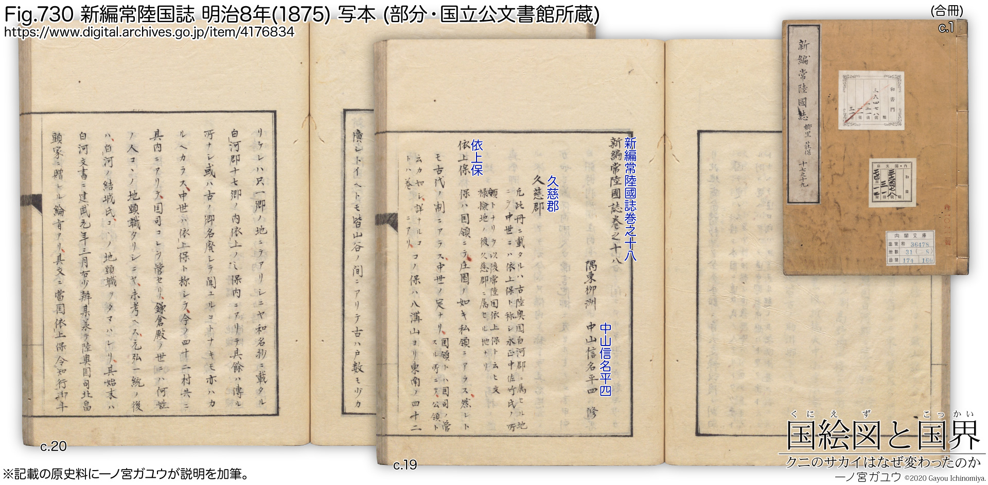 『新編常陸国誌』(新編常陸) は中山信名原著、色川三中校訂、栗田寛増補・修訂による常陸国の地誌。中山の存命中には完成せず (天保7年(1836) 没)、色川が校訂したものを明治期に入って栗田が増補・修訂し完成させた。上巻は明治32年(1899)、下巻は明治34年(1901)の刊行。都邑・村落・文書の 3部門は原書にない。また建置沿革・神社・仏寺・官職などにも増補部分が多いとされる※4。これによって本書の史料価値が下がるわけではないが、純粋な近世の地誌ではない点には注意が必要となる。国立公文書館に「色川氏本」を明治8年(1875) に写したもの (#1214266)が所蔵・公開されている。