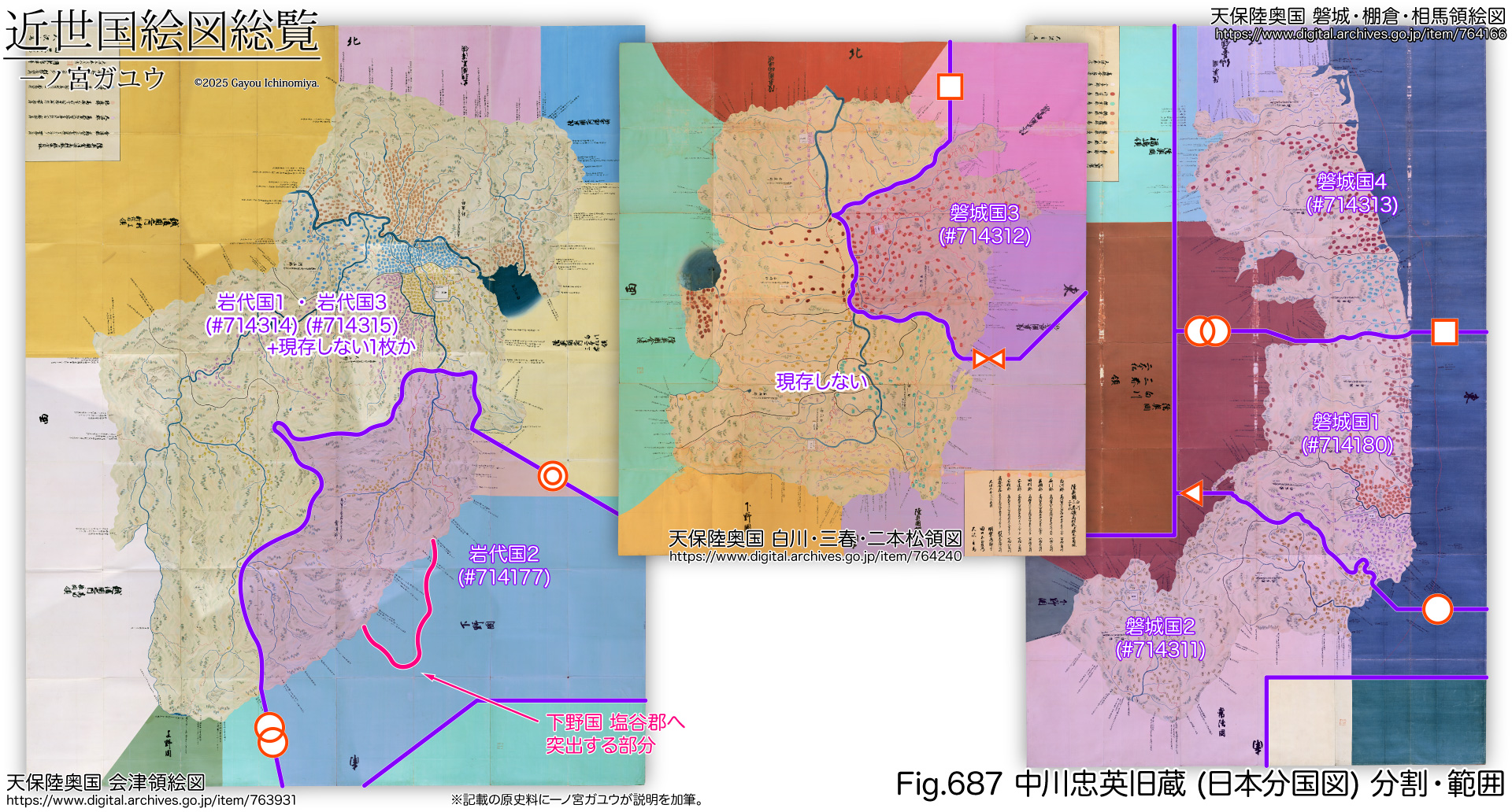 ここでは陸奥国と出羽国について、わかりづらい国絵図における分割単位を解説するとともに、同様にわかりづらい寛文年間(1661~1673) の郡の再編と明治期の分置、さらに廃藩置県とその後の府県再編において各国各郡はどのように変遷したのかをまとめています。さらに、その分置にともなって再整理されてしまったばかりに混乱がみられる、中川忠英旧蔵各国絵図の本来の組み合わせを解説しています。