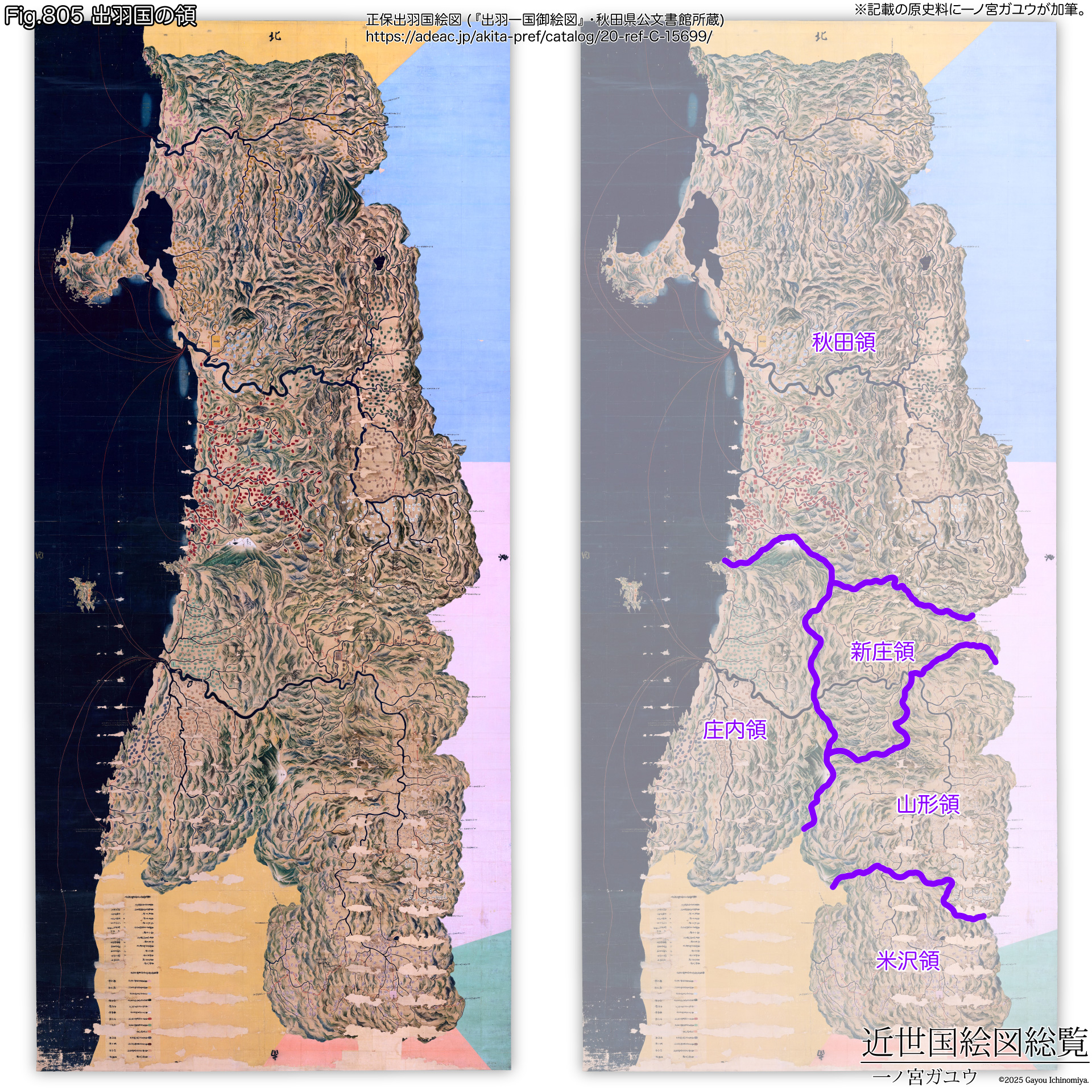 一方、元禄・天保国絵図では陸奥国と同様に領ごとに作成された。『出羽一国御絵図』に元禄・天保国絵図の各領を示せば以下のとおりである。