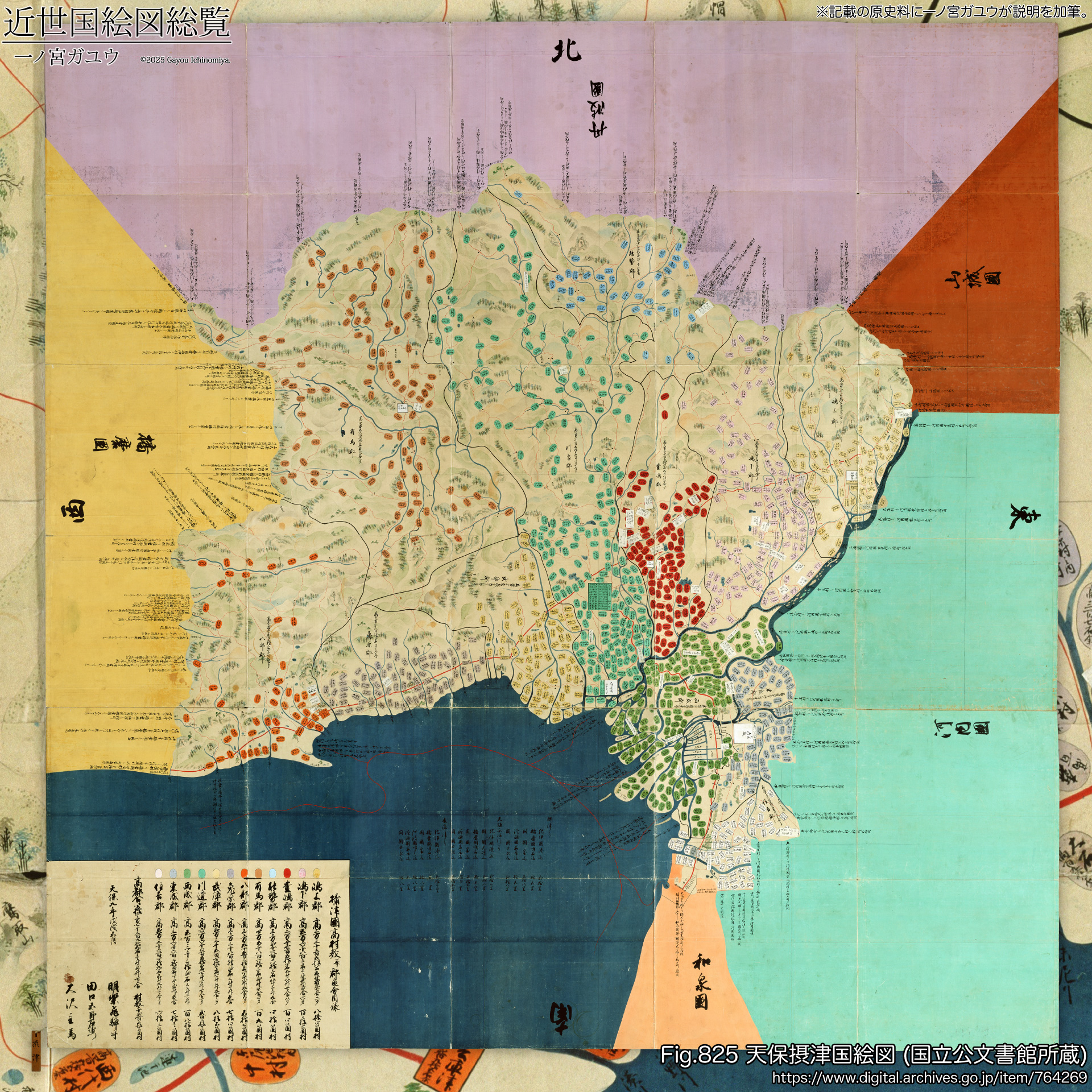 冒頭で言及のとおり、『天保摂津国絵図』は国立公文書館に勘定所旧蔵 (#764269) が現存・オンライン公開されている。