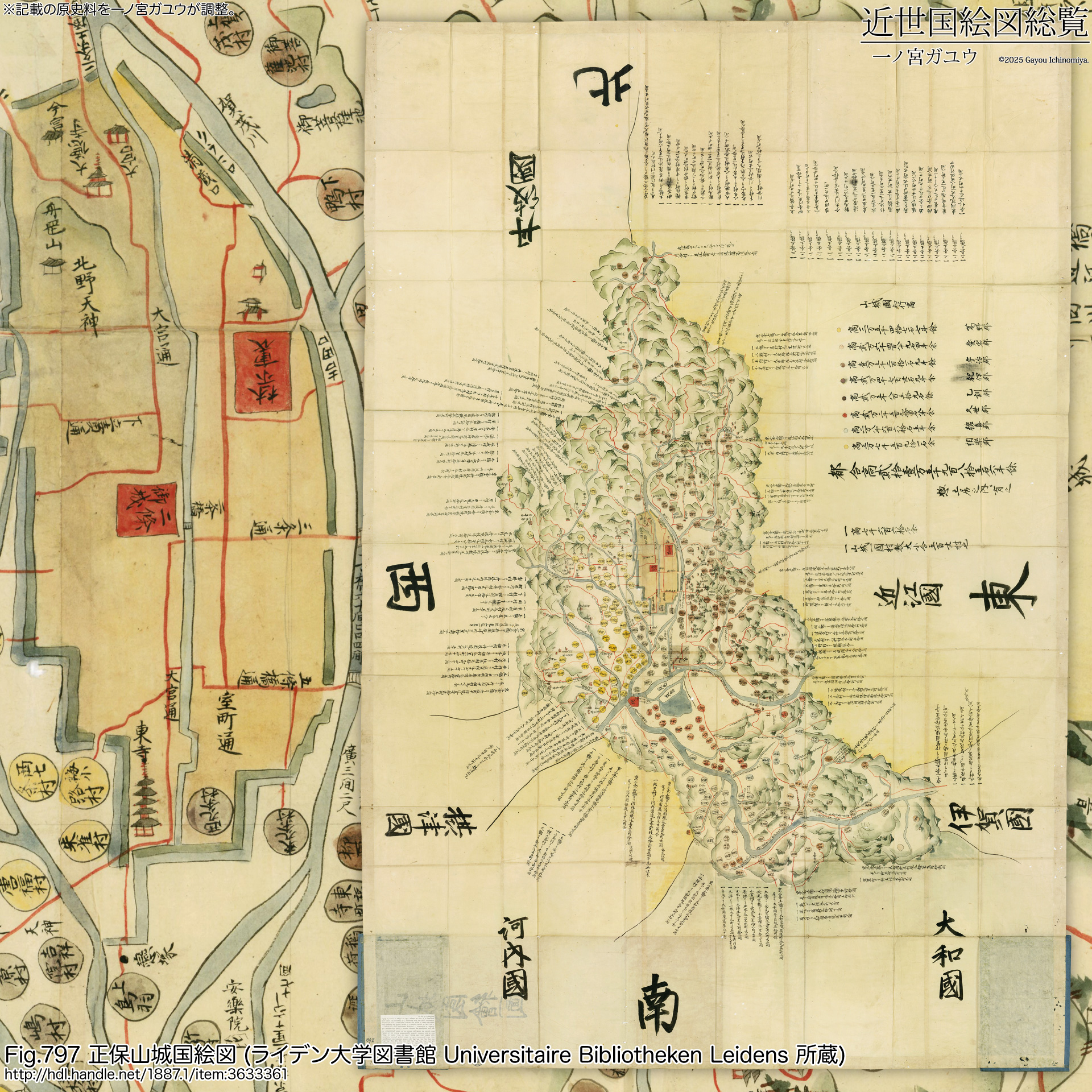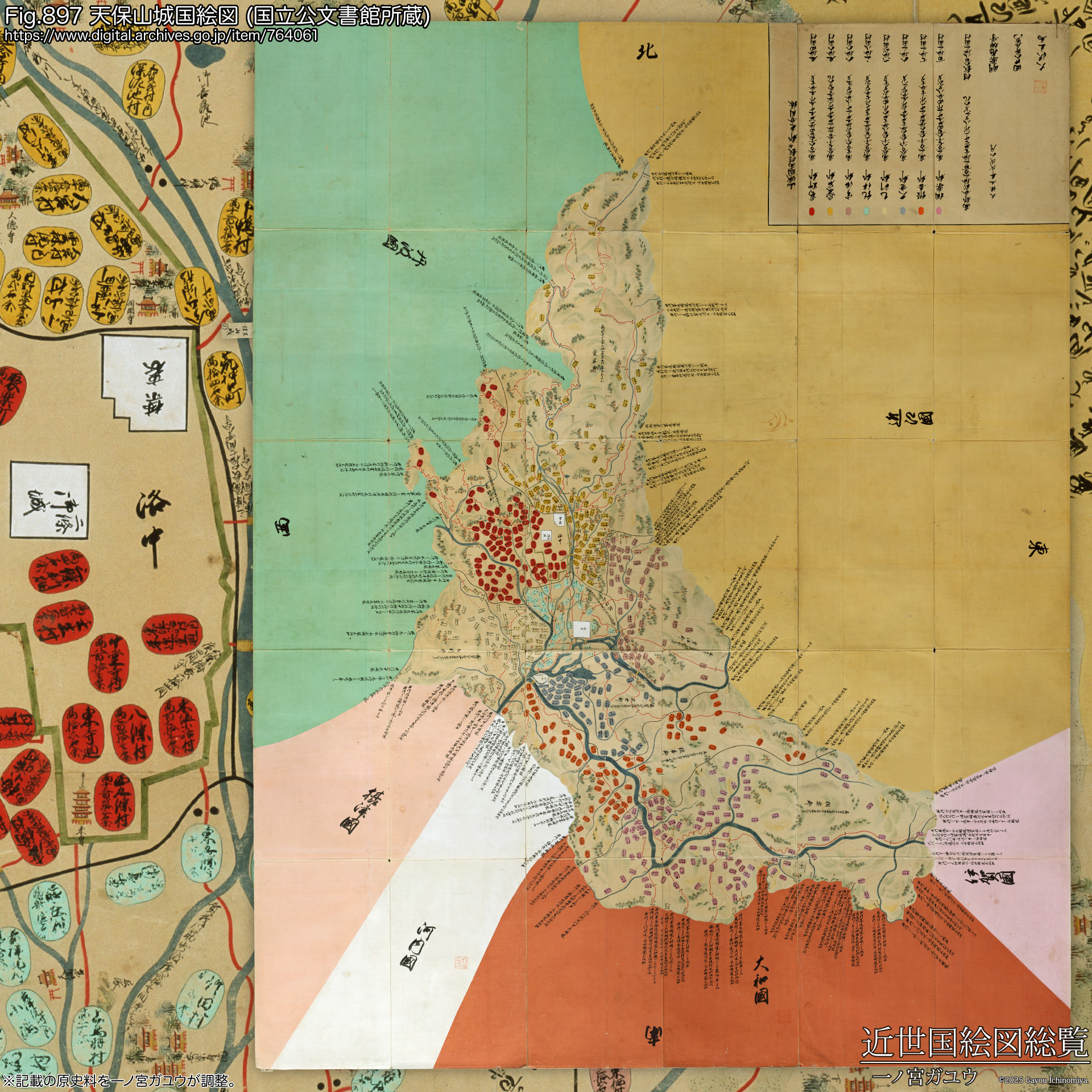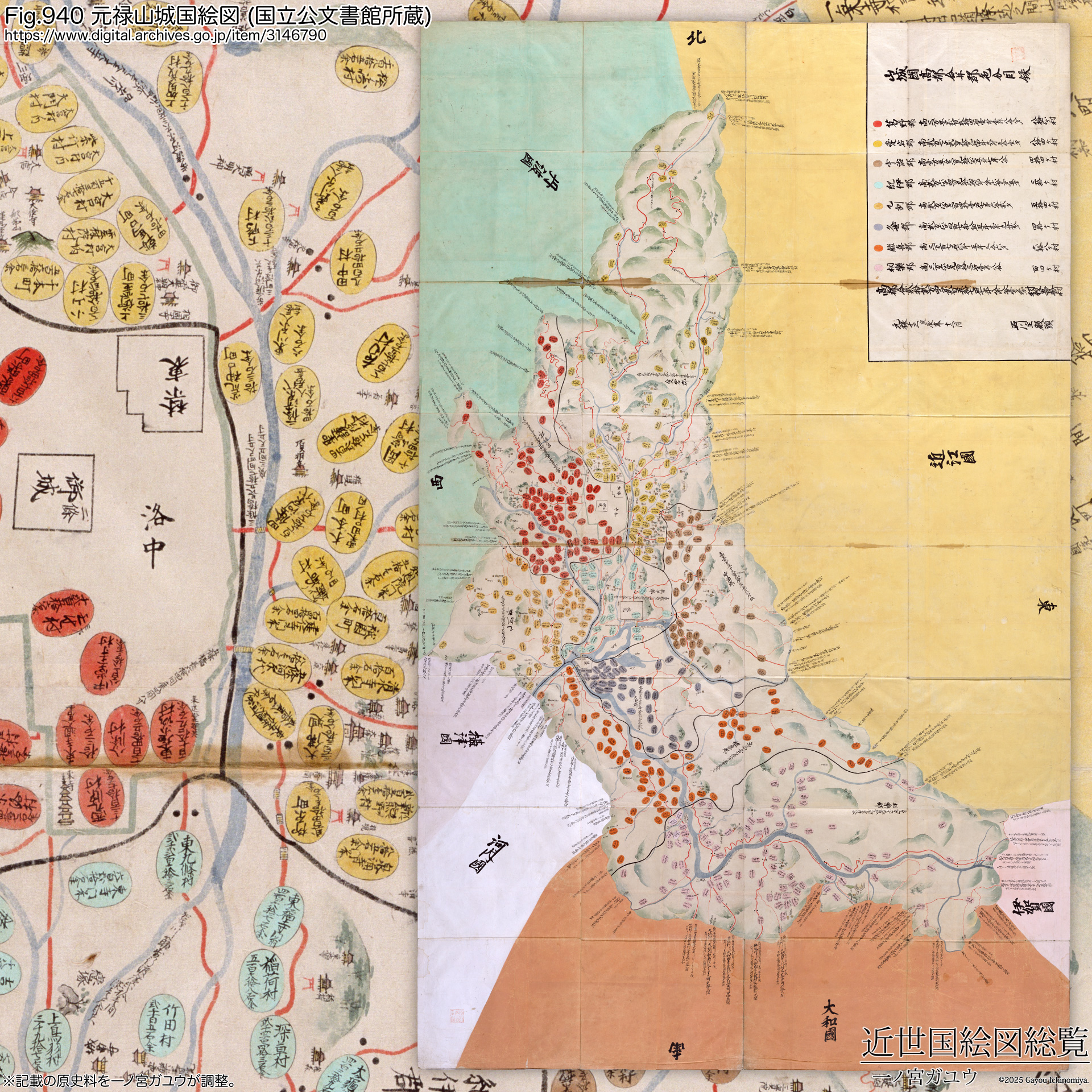 山城国については正保以降の国絵図 (『正保山城国絵図』『元禄山城国絵図』『天保山城国絵図』) が現存し、これは比較的充実しているほうである。『正保山城国絵図』についてはライデン大学図書館所蔵がオンライン公開されている。