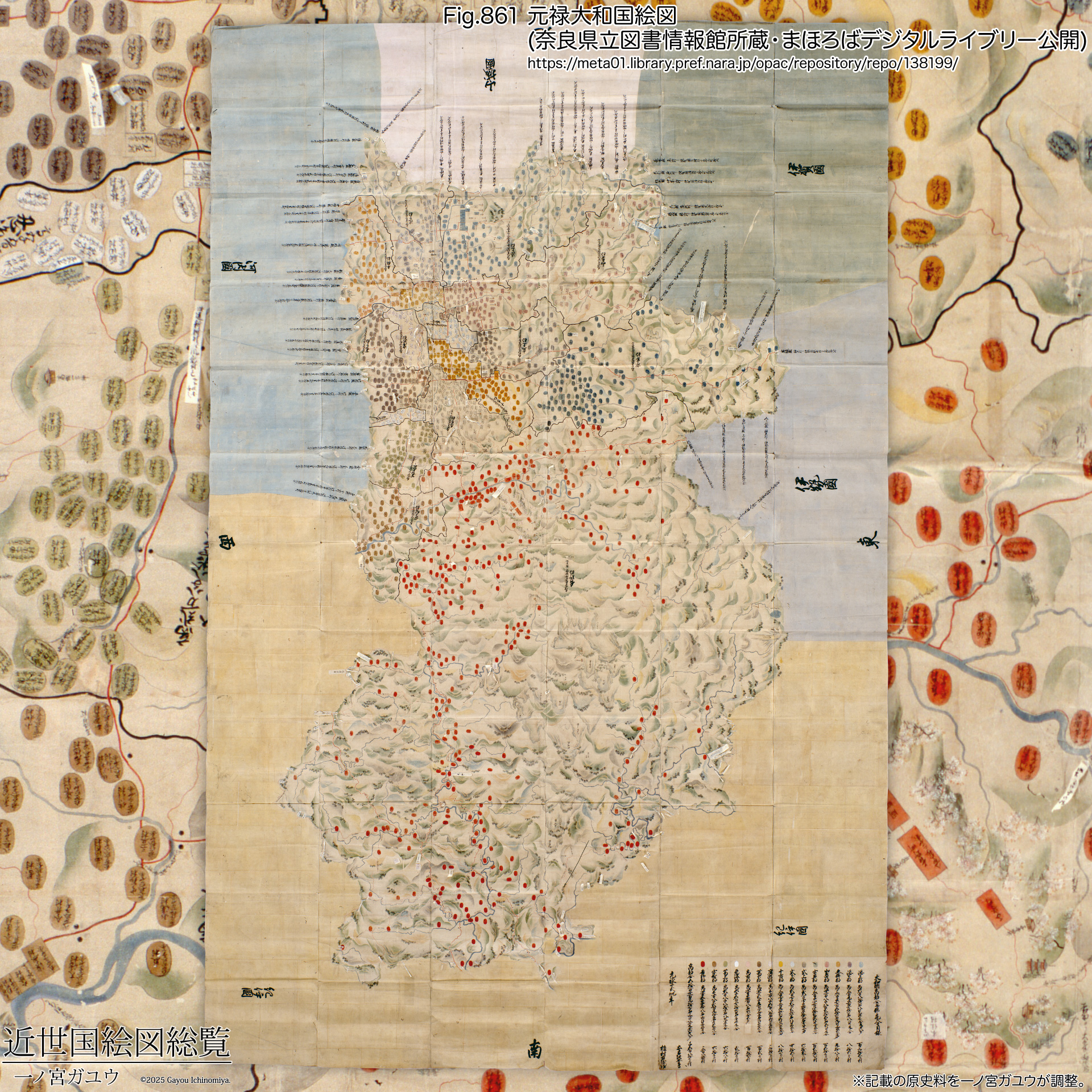 大和国絵図については『江戸幕府撰大和国絵図の現存状況と管見した図の正確について』(礒永、『奈良県立民族博物館紀要 第16巻』(1999)※1) に詳しい。