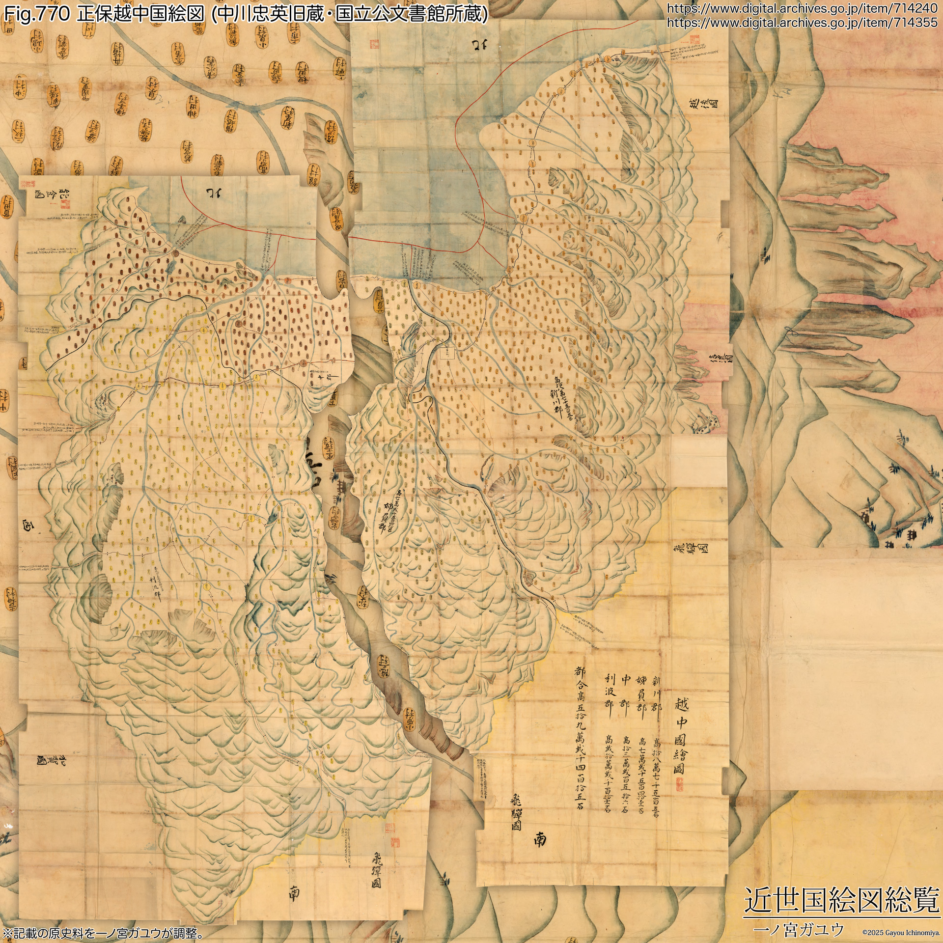 国立公文書館所蔵、中川忠英旧蔵の国絵図群 (通称『日本分国図』) には越中国のものが含まれ、現存・オンライン公開されている (#714355 #714240),。