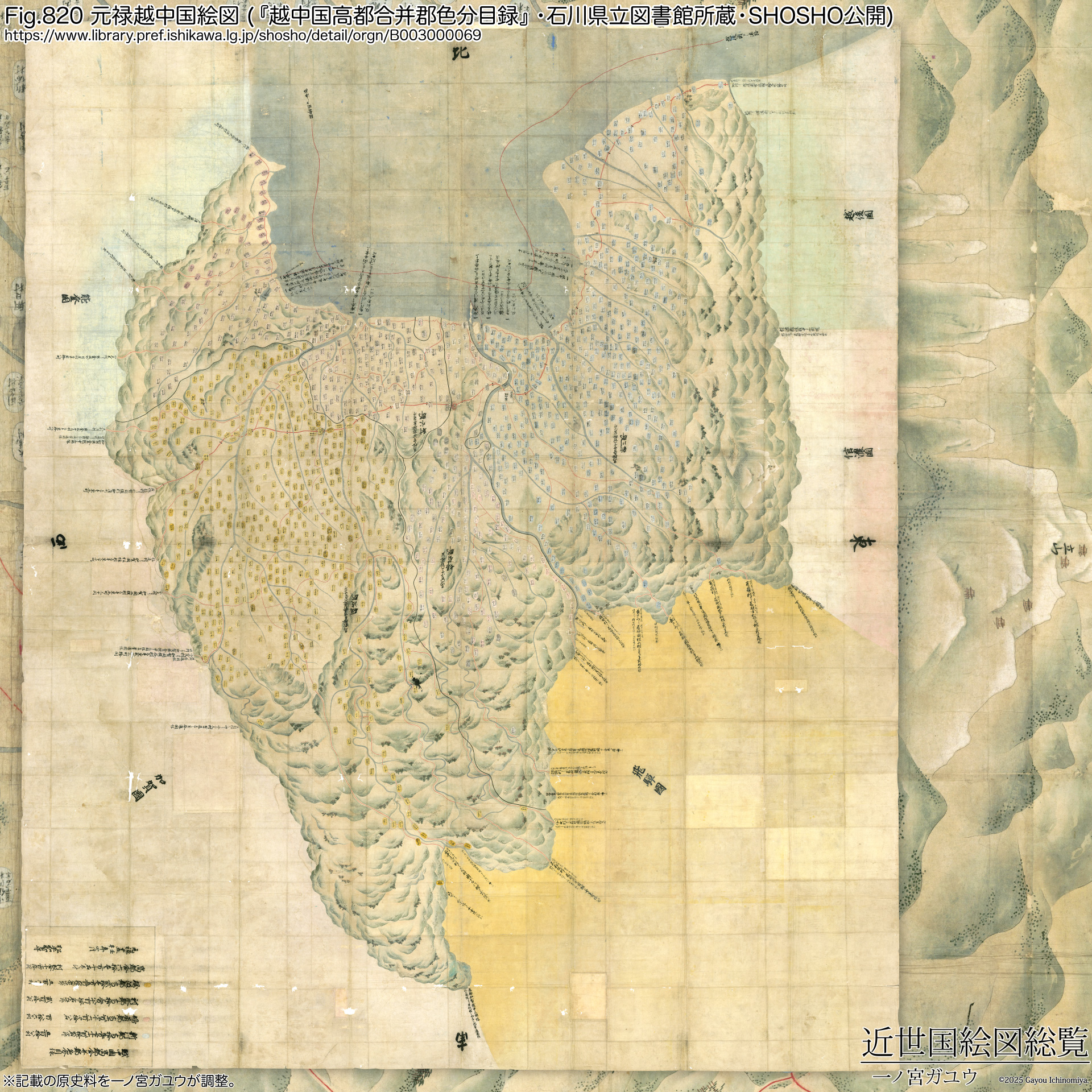 石川県立図書館には『元禄越中国絵図』が『越中国高都合并郡色分目録』として現存し、オンライン公開されている。