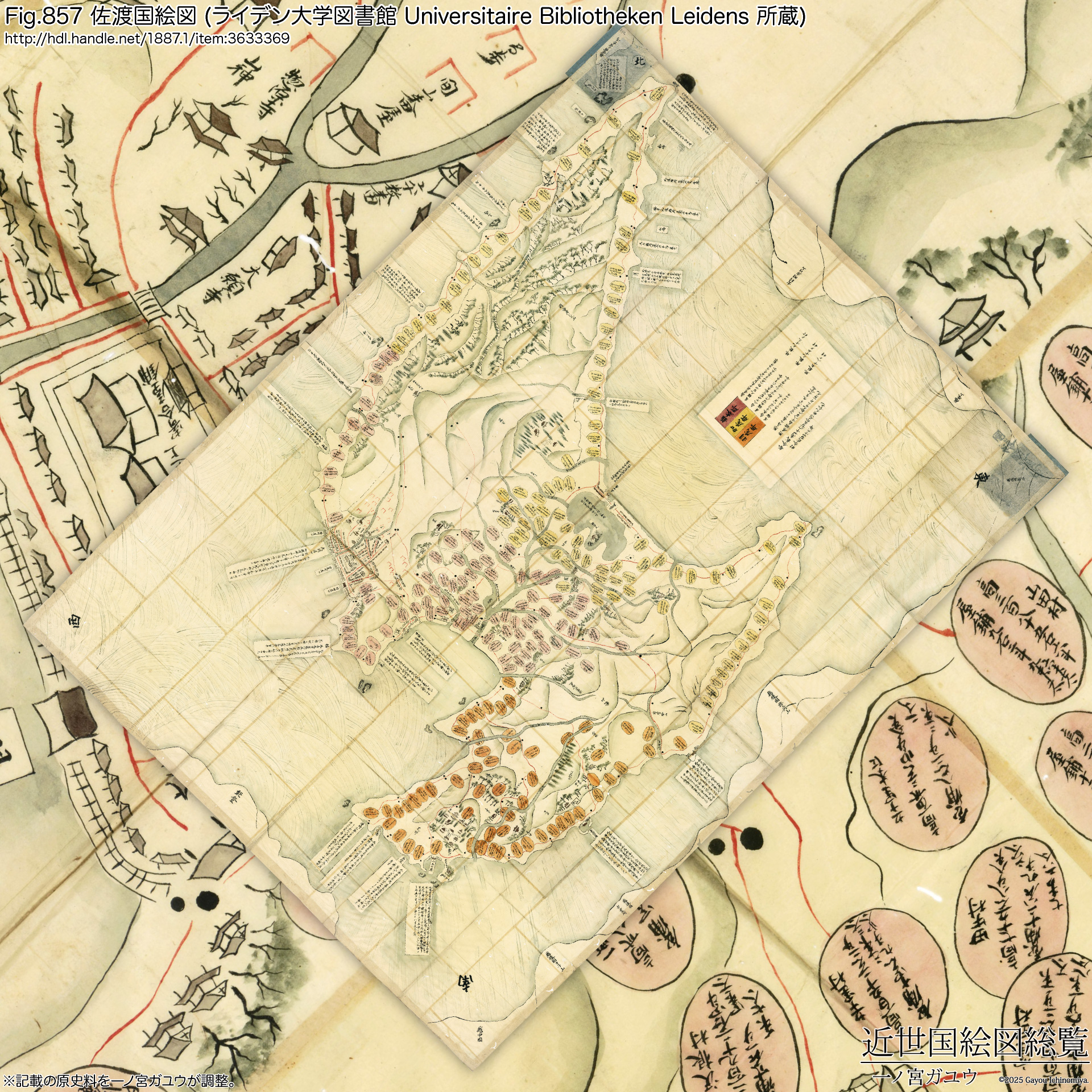 新潟県立歴史博物館には『佐州全図』が現存し、オンライン公開されている。画像データとしては 1,293 × 1,200ピクセルで、jmapps.ne.jpドメインで御馴染の拡大する機能を備えたビューアが提供されている※1。当然ながら外観を確認できるだけである。