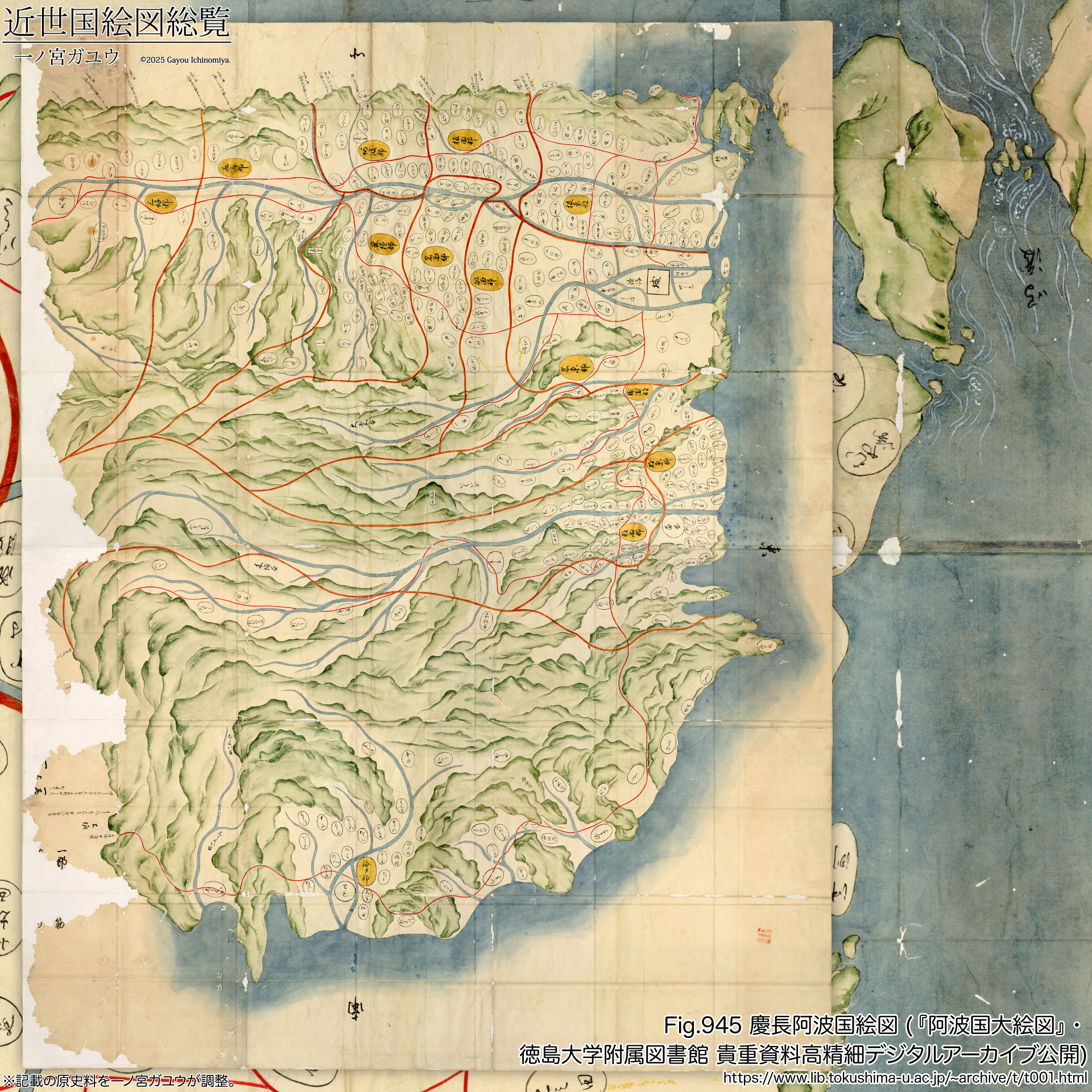 『阿波国大絵図』(t001)は徳島大学附属図書館に現存し、貴重資料高精細デジタルアーカイブで公開されている国絵図である。