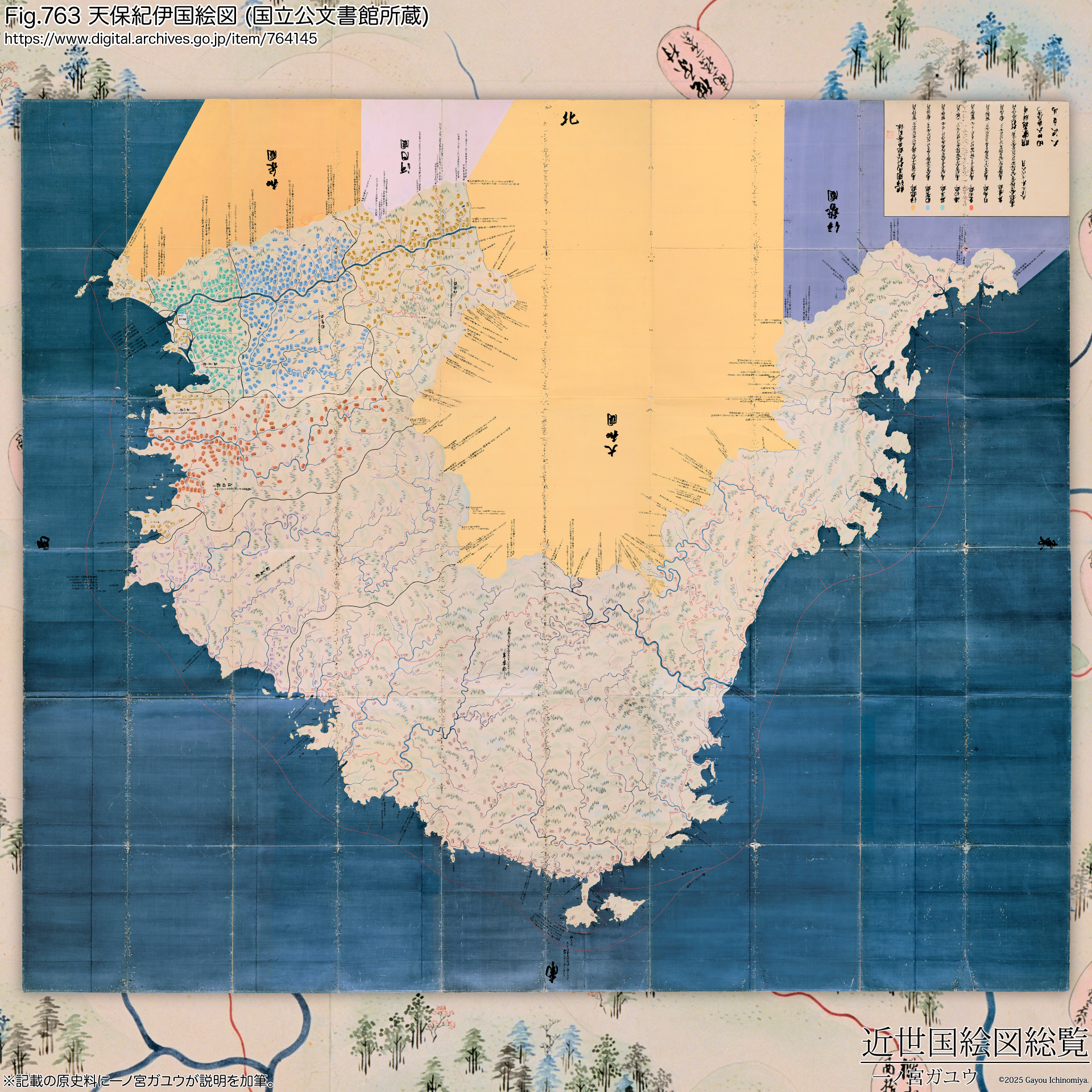 ↓一覧へ移動紀伊国 (紀州) は南海道に属する国である。国立公文書館所蔵の『天保紀伊国絵図』は紅葉山文庫旧蔵・勘定所旧蔵の両方が現存し、紅葉山文庫旧蔵 (#764145) がオンライン公開されている。