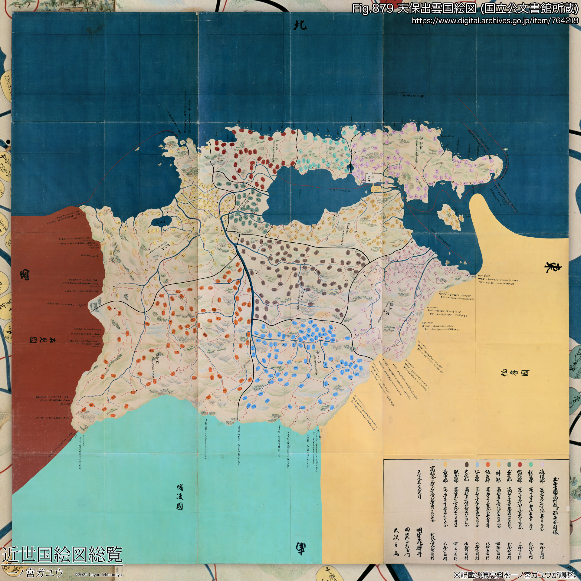 冒頭で言及のとおり、『天保出雲国絵図』は国立公文書館に紅葉山文庫旧蔵・勘定所旧蔵の両方が現存し、紅葉山文庫旧蔵 (#764219) がオンライン公開されている。