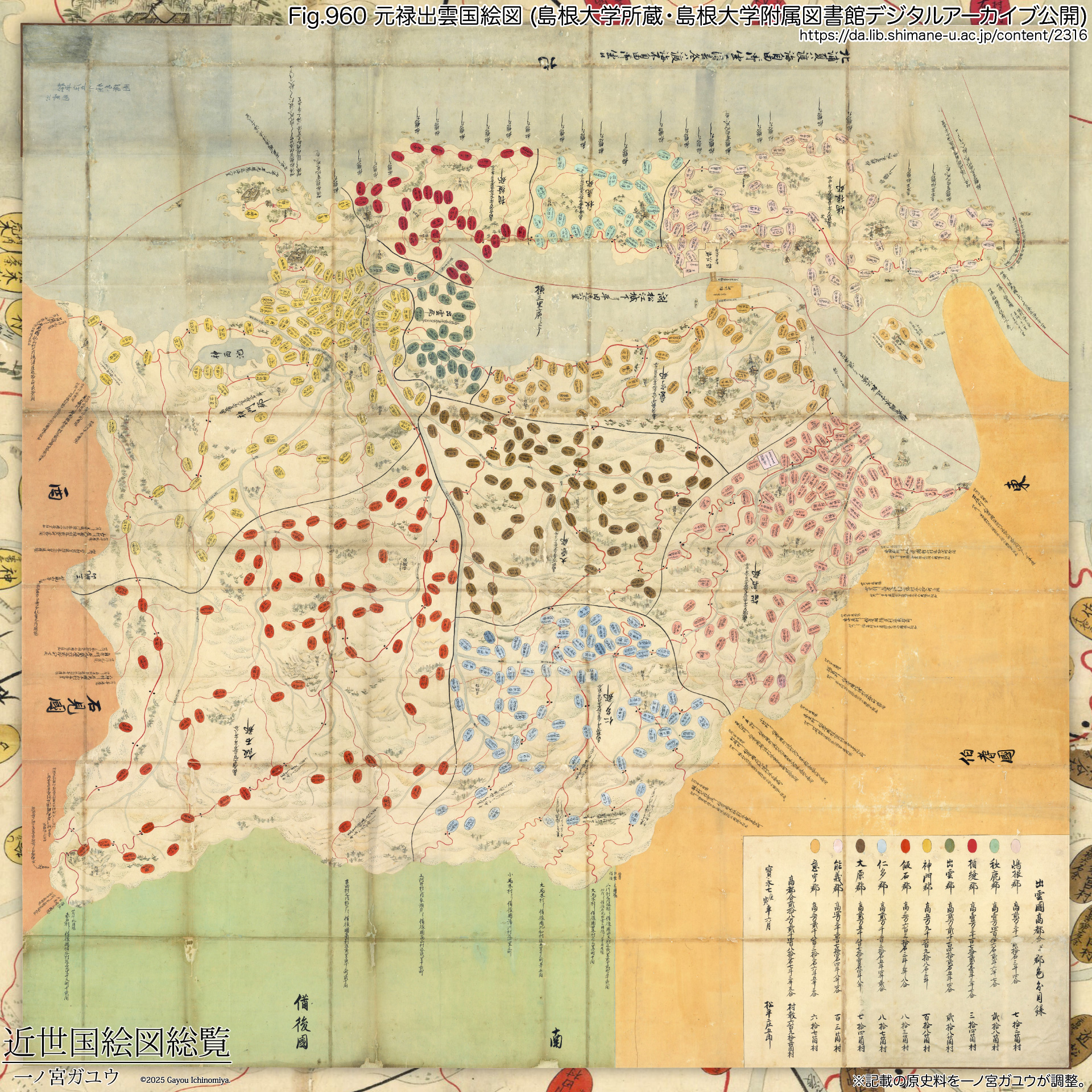 出雲国の場合、さらに島根大学にも現存し、島根大学附属図書館デジタルアーカイブでは『[寛永出雲国絵図]』(#4162)が公開されている。