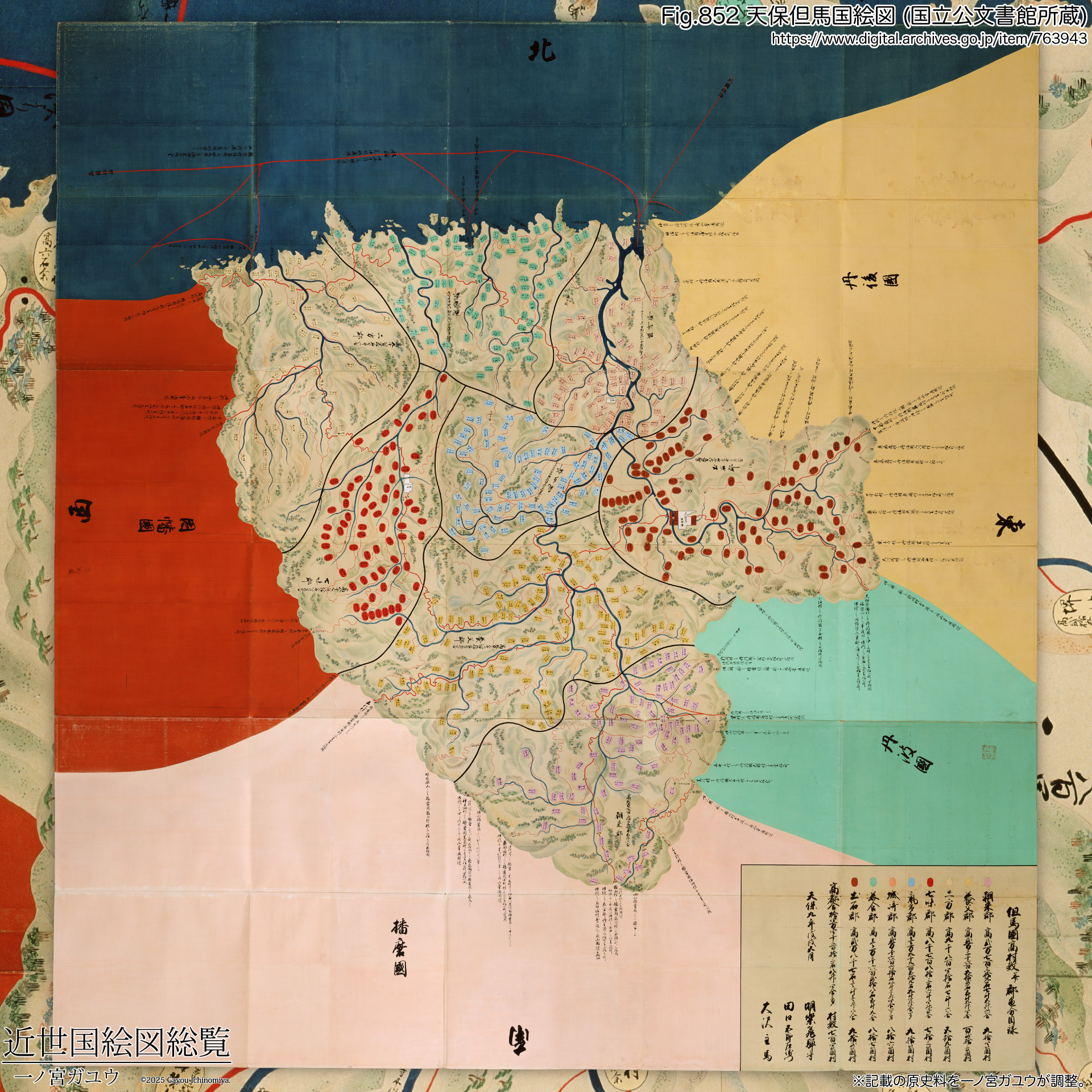 国立公文書館所蔵、中川忠英旧蔵の国絵図群 (通称『日本分国図』) には但馬国のものが 2分割された形式で含まれ、うち東南部過半の部分 (出石・養父・朝来 3郡) がオンライン公開されている (#714174)。