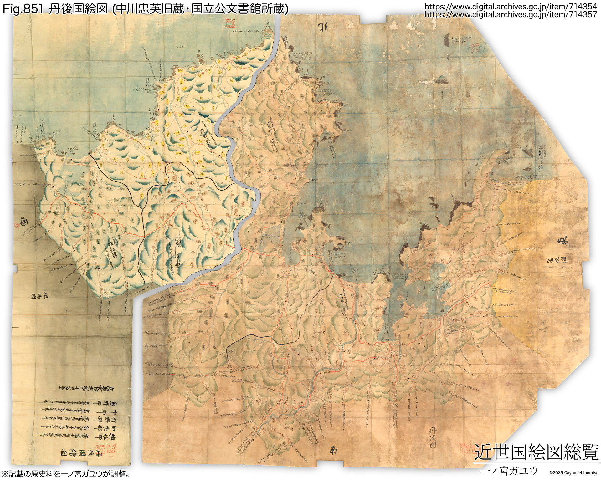 国立公文書館所蔵、中川忠英旧蔵の国絵図群 (通称『日本分国図』) には丹後国のものが 2分割された形式で含まれ、すべて現存・オンライン公開されている (#714354 #714357)。