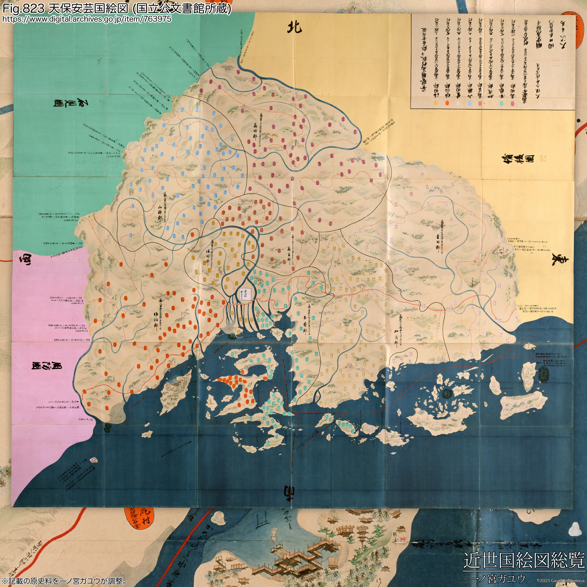 冒頭で言及のとおり、『天保安芸国絵図』は国立公文書館に紅葉山文庫旧蔵 (#763975) が現存・オンライン公開されている。