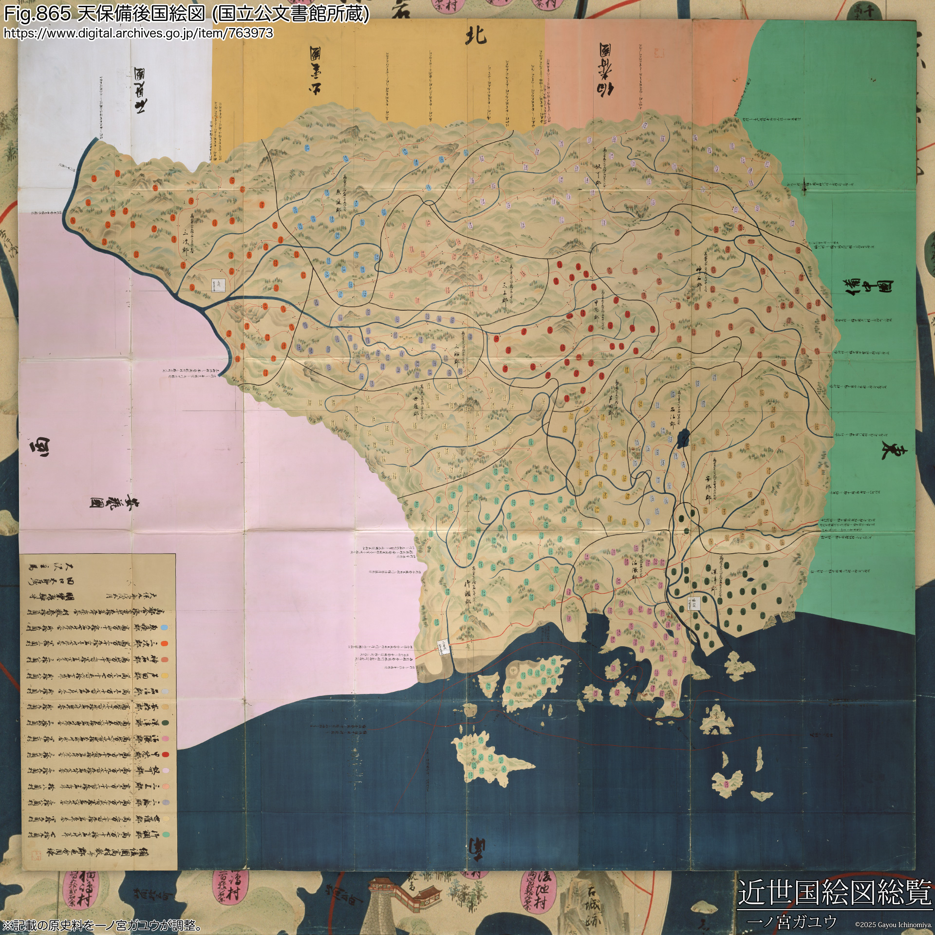 ↓一覧へ移動備後国は山陽道に属する国である。国立公文書館所蔵の『天保備後国絵図』は紅葉山文庫旧蔵・勘定所旧蔵の両方が現存し、紅葉山文庫旧蔵 (#763973) がオンライン公開されている。