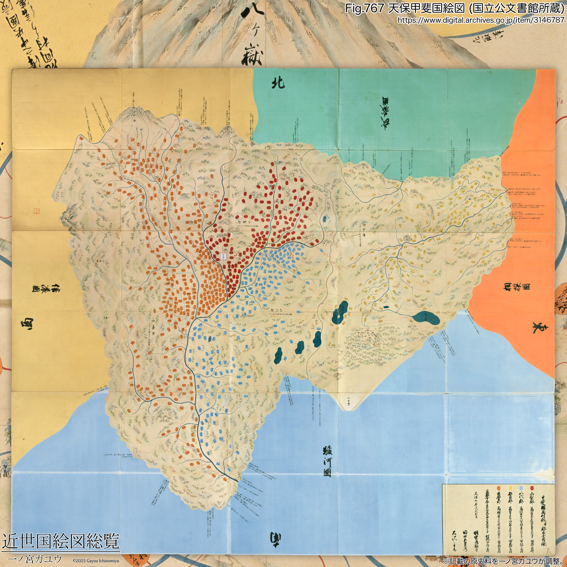 ↓一覧へ移動甲斐国 (甲州) は東海道に属する国である。国立公文書館所蔵の『天保甲斐国絵図』は紅葉山文庫旧蔵 (#3146787) が現存・オンライン公開されている。