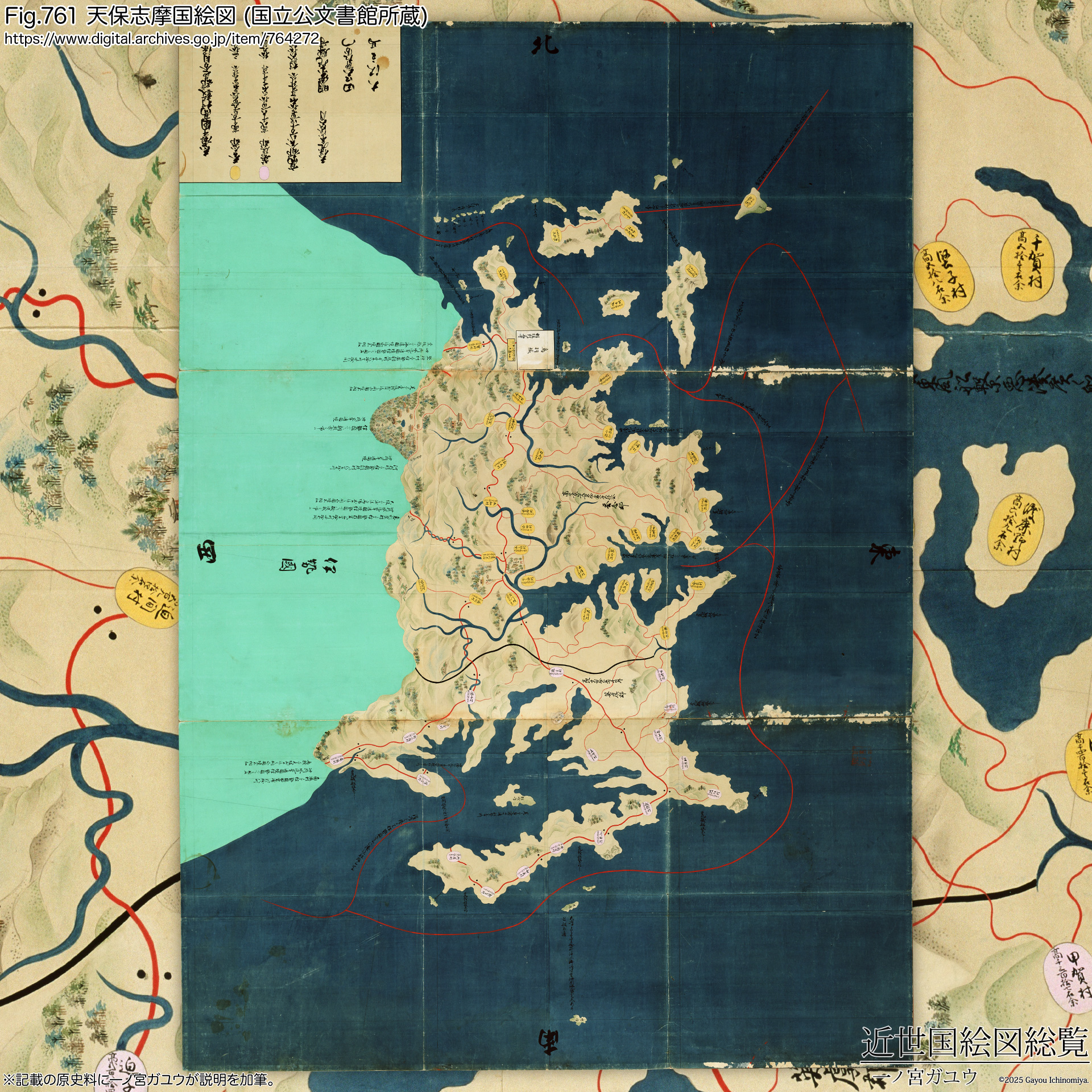 冒頭で言及のとおり、『天保志摩国絵図』は国立公文書館に紅葉山文庫旧蔵・勘定所旧蔵の両方が現存し、紅葉山文庫旧蔵 (#764272) がオンライン公開されている。