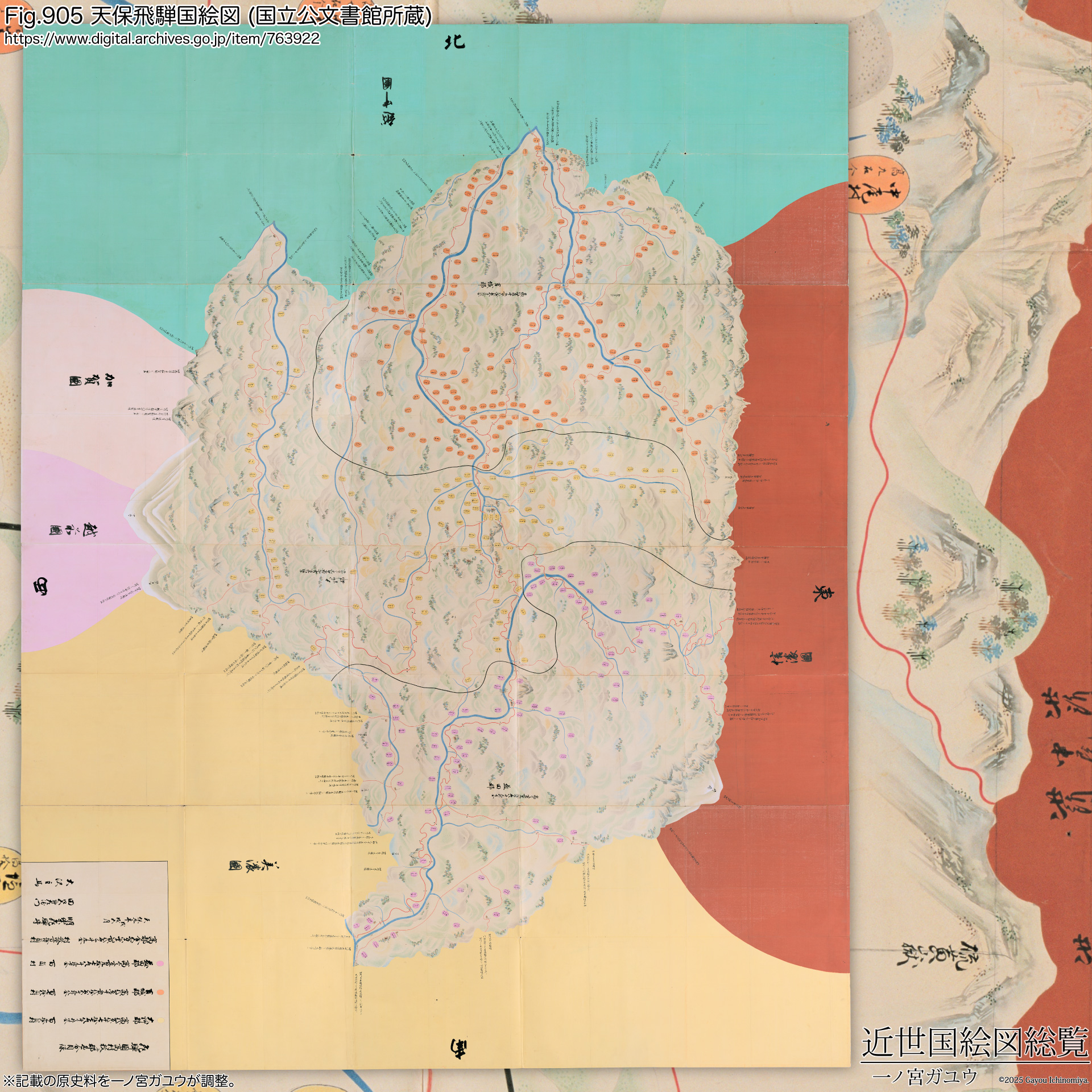 ↓一覧へ移動飛騨国は東山道に属する国である。国立公文書館所蔵の『天保飛騨国絵図』は紅葉山文庫旧蔵 (#763922) が現存・オンライン公開されている。