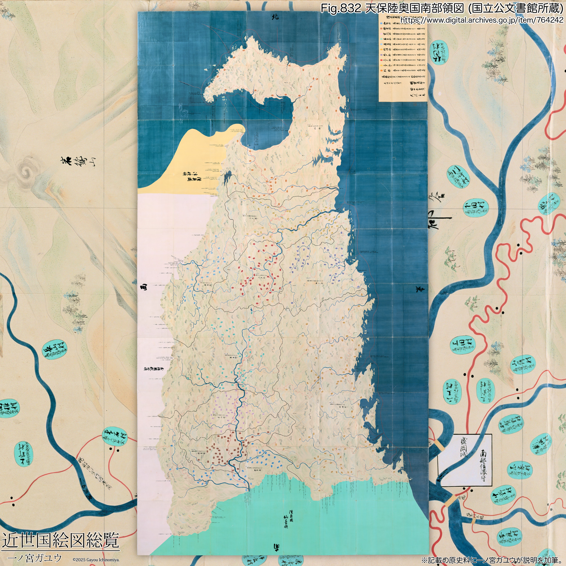 冒頭で言及のとおり、『天保陸奥国南部領絵図』は国立公文書館に紅葉山文庫旧蔵 (#764242) が現存・オンライン公開されている。