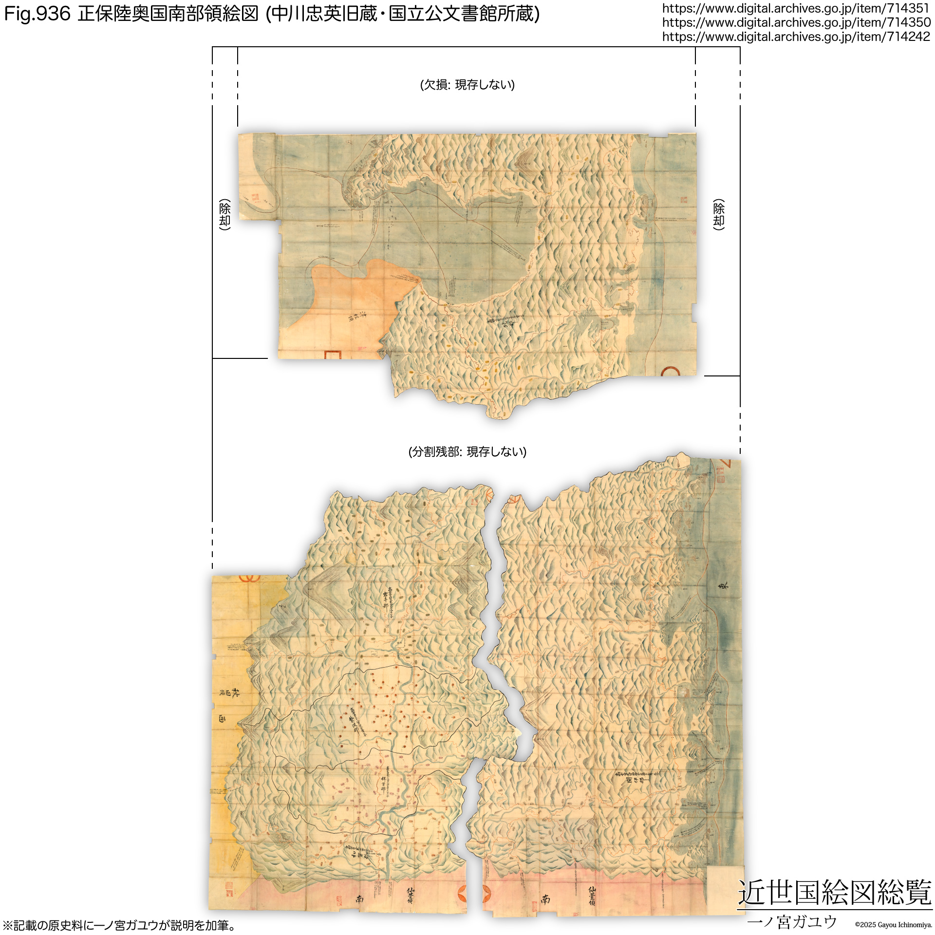 国立公文書館所蔵、中川忠英旧蔵の国絵図群 (通称『日本分国図』) には陸奥国 南部領のものが分割された形式で含まれ、うち3枚 (#714351 #714350