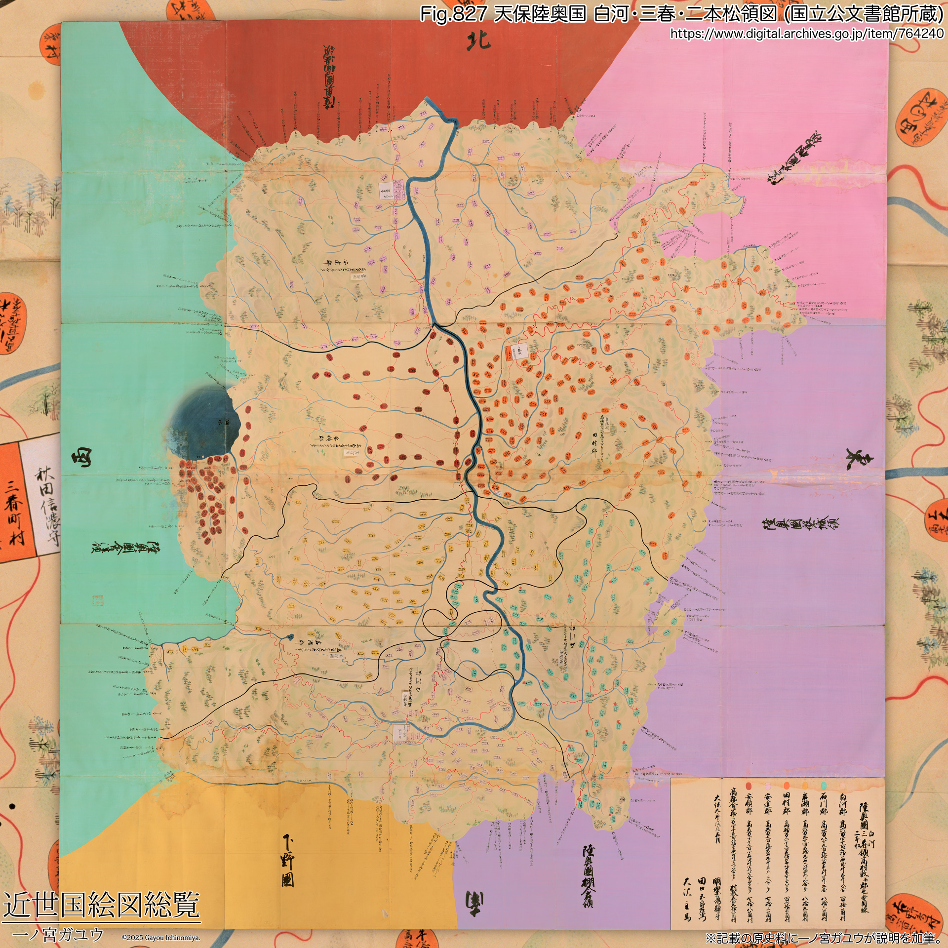 | 天保 | 筆者 | 陸奥国 白河二本松三春領絵図 #1 #2 #3 | 福島県立図書館 デジタルライブラリー | 下 元禄国絵図の6分割の写しに重ねて変更内容を描いた薄紙 (懸紙)。 | ||