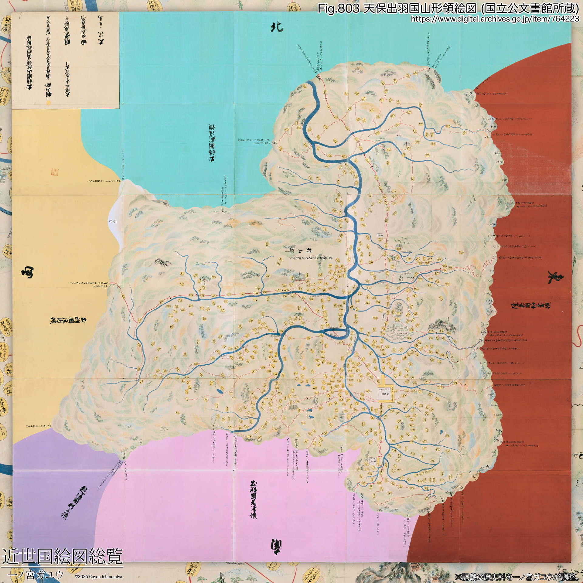 国立公文書館所蔵の『天保出羽国山形領絵図』は紅葉山文庫旧蔵・勘定所旧蔵の両方が現存し、紅葉山文庫旧蔵 (#764223) がオンライン公開されている。山形領絵図に限っていえば正保・元禄とも確認できず、国絵図の現存状況としては最小限である。