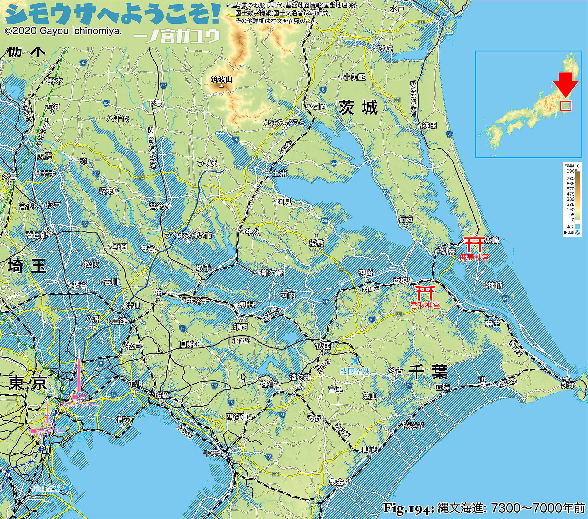 奥東京湾の最奥部である古河付近については『古奥東京湾周辺における縄文時代黒浜期の貝塚形成と古環境』(1989, 小杉ほか)、古鬼怒湾の最奥部のひとつである常陸川源流付近については『利根川・鬼怒川の瀬替えによる利根川中流低地の地形環境変化』(1992, 大河原ほか)、大宮台地付近については『珪藻遺骸群集による縄文海進期の想定海岸線と貝塚分布との関係』(1997, 安藤ほか)、鹿島付近については『鹿島灘沿岸における砂丘の南北変化について』(2000, 柏木ほか) を参考にした。