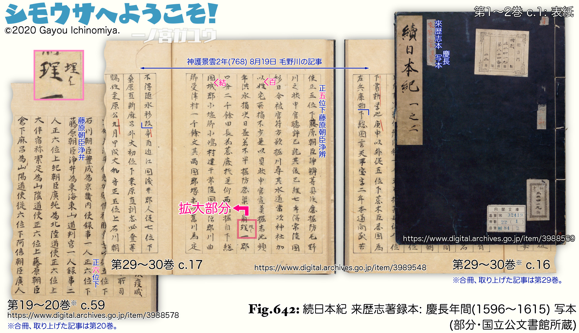 神護景雲2年(768) 8月19日の毛野川の記事を明暦3年(1657) 刊本と比較すると、「百姓」の「百」と「結城郡」の「結」が脱け、藤原朝臣浄弁の官位が「正五位下」となっている (刊本では『正六位下』)。もちろん刊本は校訂されている可能性があるものの、天平宝字2年(765) 7月3日の記事では「正五位下」とあり、また両者を比較するとよくわかるが、神護景雲は筆の運びがややおぼつかなく、ひとまず見たままに書き写しているだけの印象がある。拡大した部分にある訂正から考えても、第29巻については何らかの理由で浄書前のものなのかもしれない。
