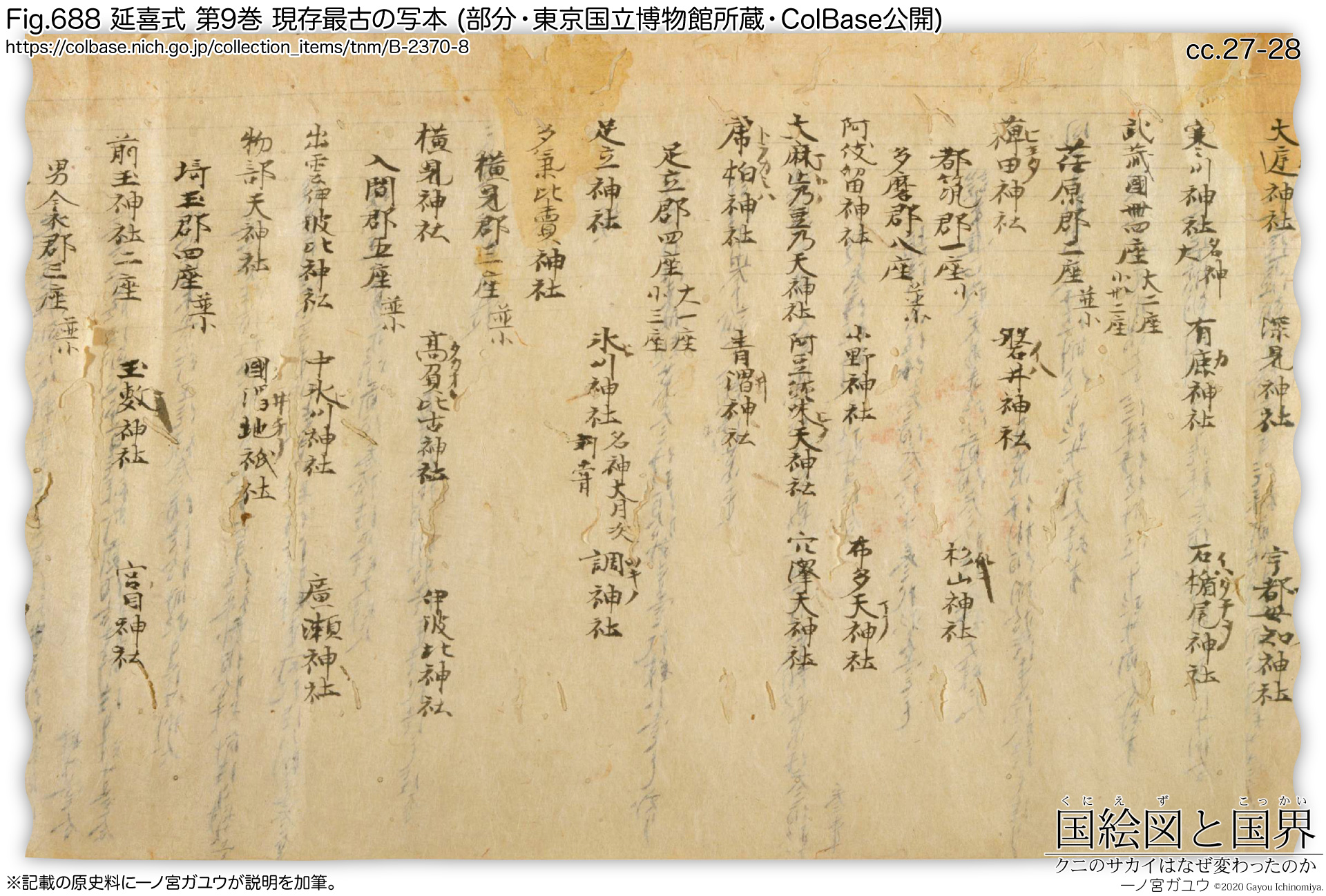 『延喜式』は養老律令に対する「式」(施行細則) を集大成した古代の法典である。延喜5年(905) に編纂をはじめ、延長5年(927) に成立した。先行する「弘仁式」「貞観式」を基に、その後の法令を網羅的に集成したものであり、特に巻9・巻10は、律令制下の神社 (官社) 2861社 (3132座) を国郡ごとに載せ、『延喜式神名帳』ともいい、古代の地名の検討するのに重要な史料となっている。平安末期の写本を東京国立博物館が所蔵、ColBaseで公開されており (#B-2370)、現存するものでは最古である。