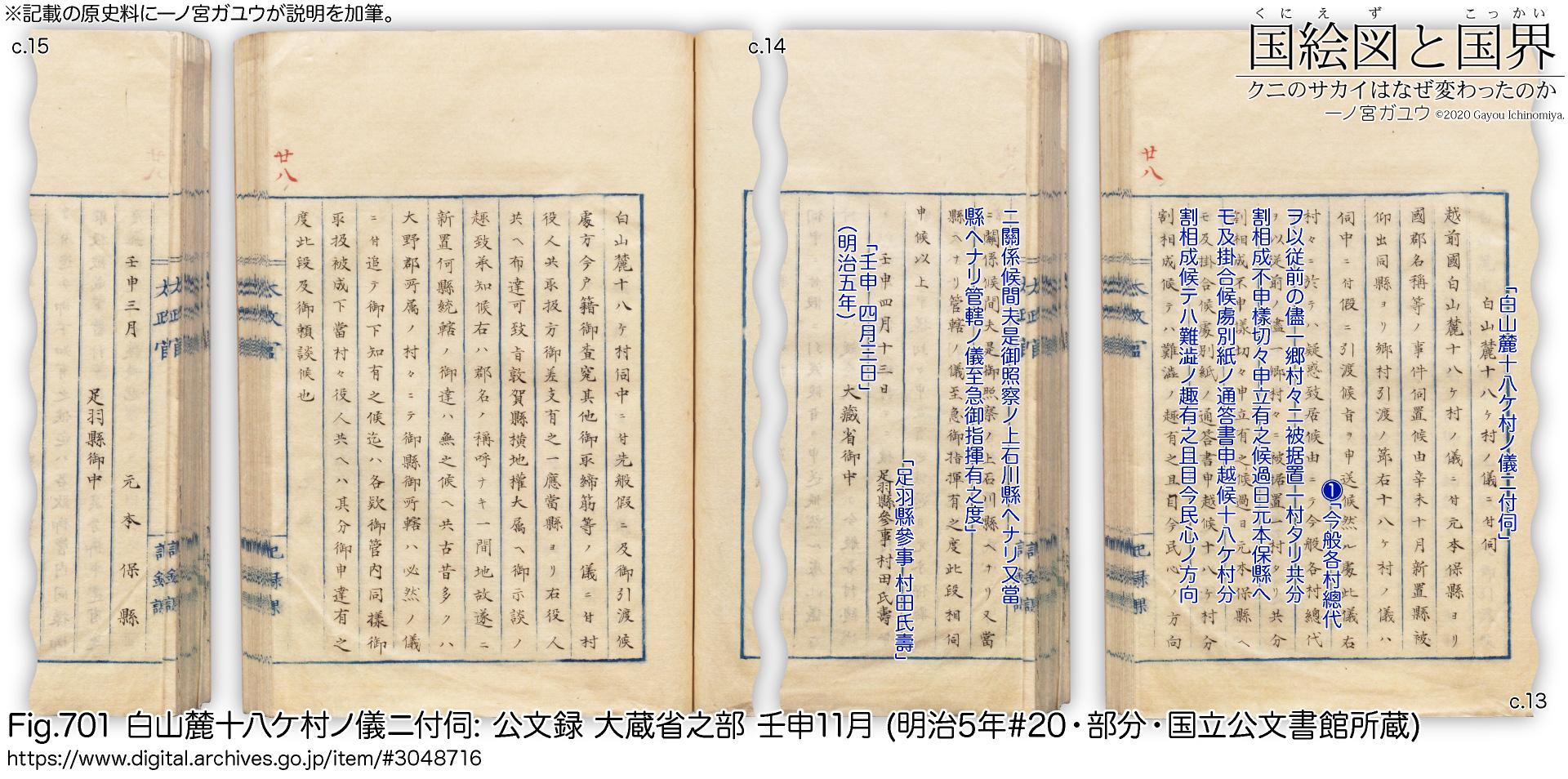 上は『石川足羽ノ両県下白山麓村落ノ儀ニ付伺』 (公文録 大蔵省之部 壬申11月, 明治5年#20; #3048716) の主文にあたる部分で (cc.1-2)、①の石川県の報告書が別紙の 1番目 (cc.3-7, 11)、足羽県の報告書が別紙の 2番目 (cc.8-9, 12) として添付されている。③はすでに引用した『白山麓十八ケ村ノ儀ニ付伺』で、3番目 (cc.13-14) に添付されている。