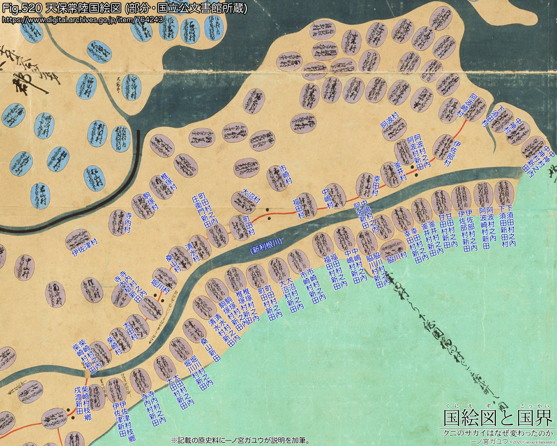 『迅速測図原図』における国界も下総・常陸の元禄国絵図のとおりで、下須田村・阿波崎村は新利根川から離れている。