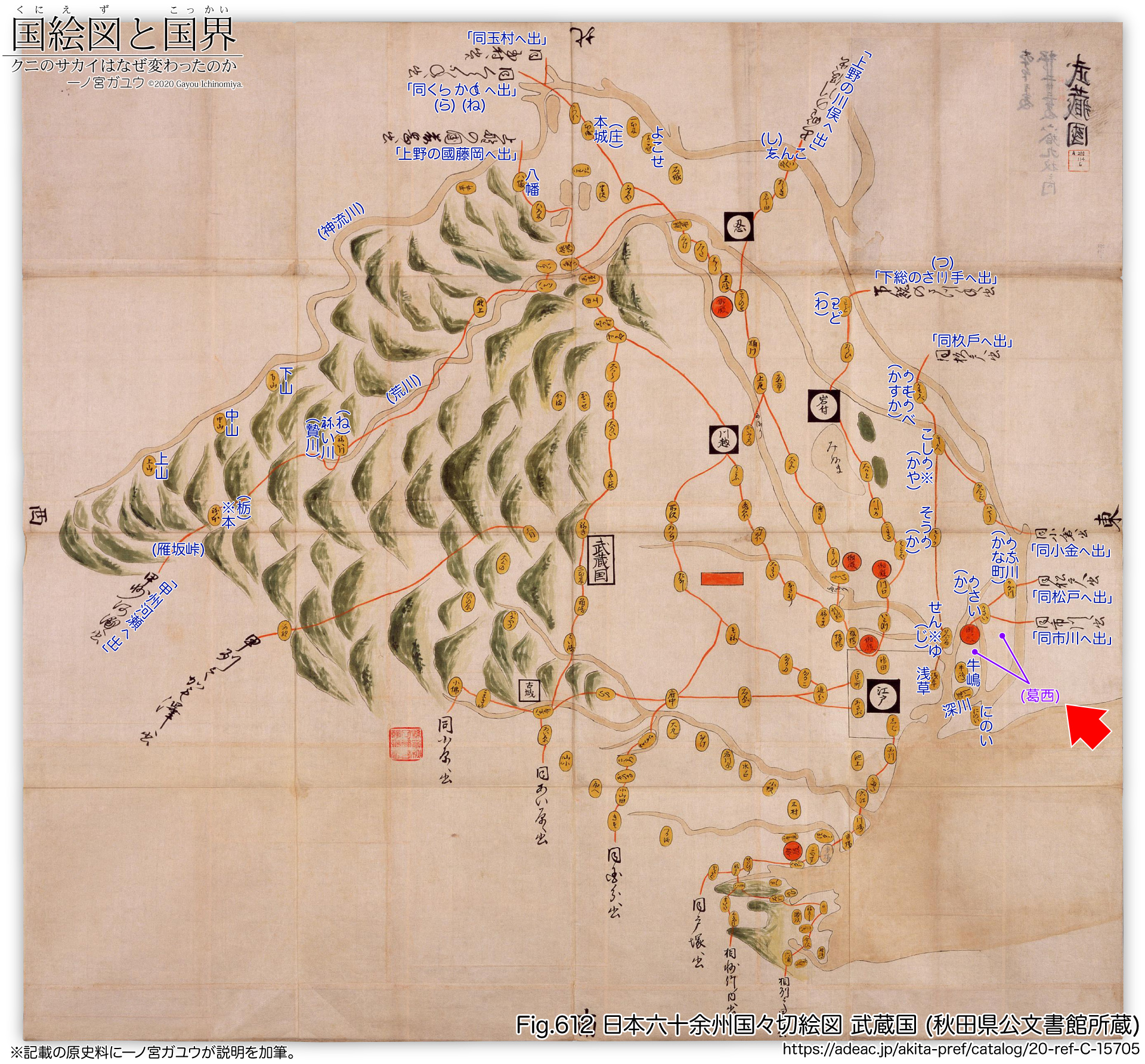 つまり描かれているのは近世の利根川 (現在の江戸川) までであって、葛西地域は下総国の外にある。武蔵国では「同市川ㇸ出」(同 = 下総) とあるところから佐倉街道がはじまり、「𛀚𛂁川」(かな川、金町)※5から来る水戸街道と合流するところに「𛀚さい」(かさい、葛西) がある。