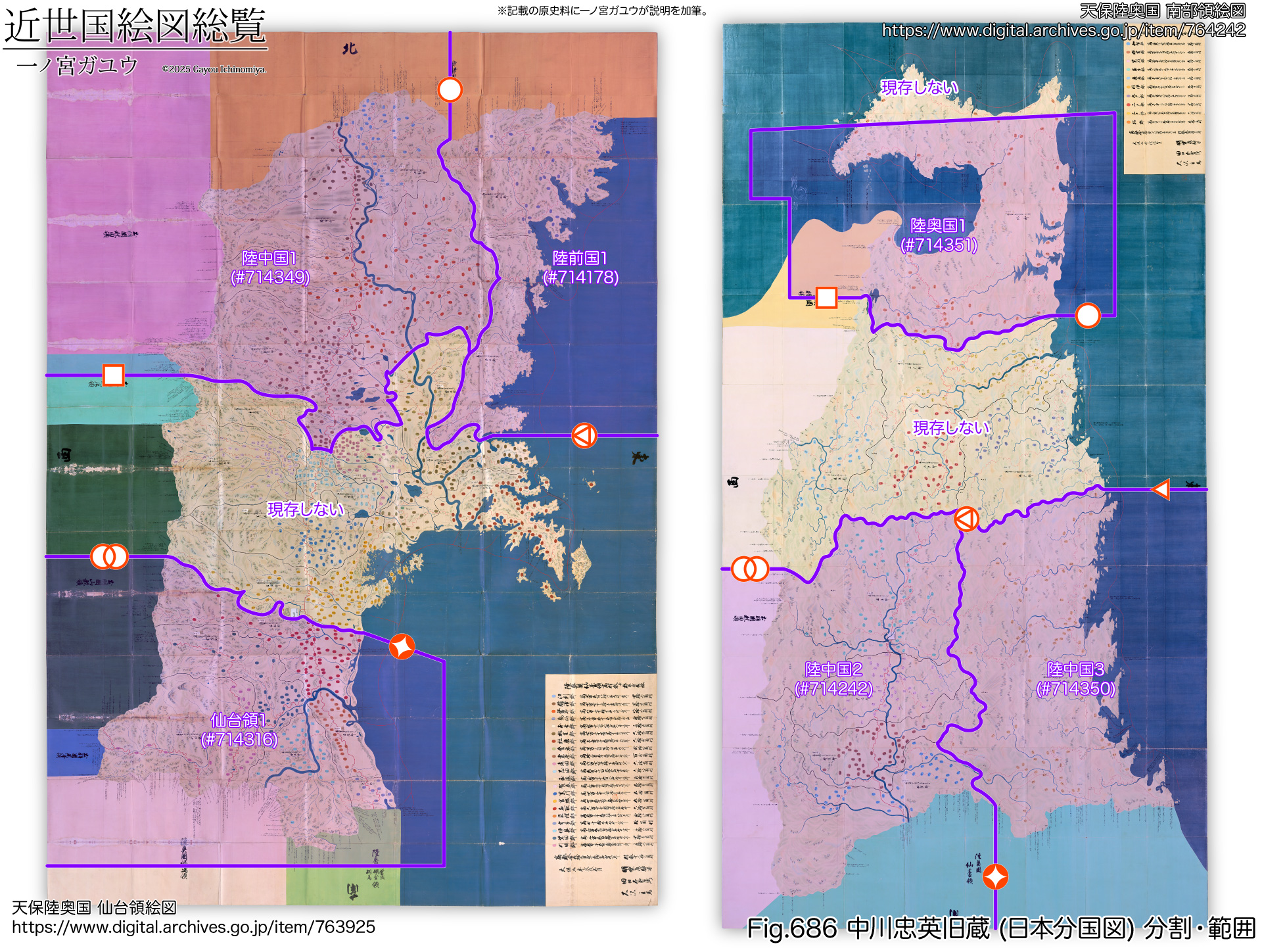 そこで各分割が本来の領絵図のどの部分であるのかを『天保陸奥国絵図』の各領絵図の上に示せば、以下のとおりである。記号はもとの接合位置・組み合わせがわかるように、分割部分にまたがるように与えられた印 (割印) である。