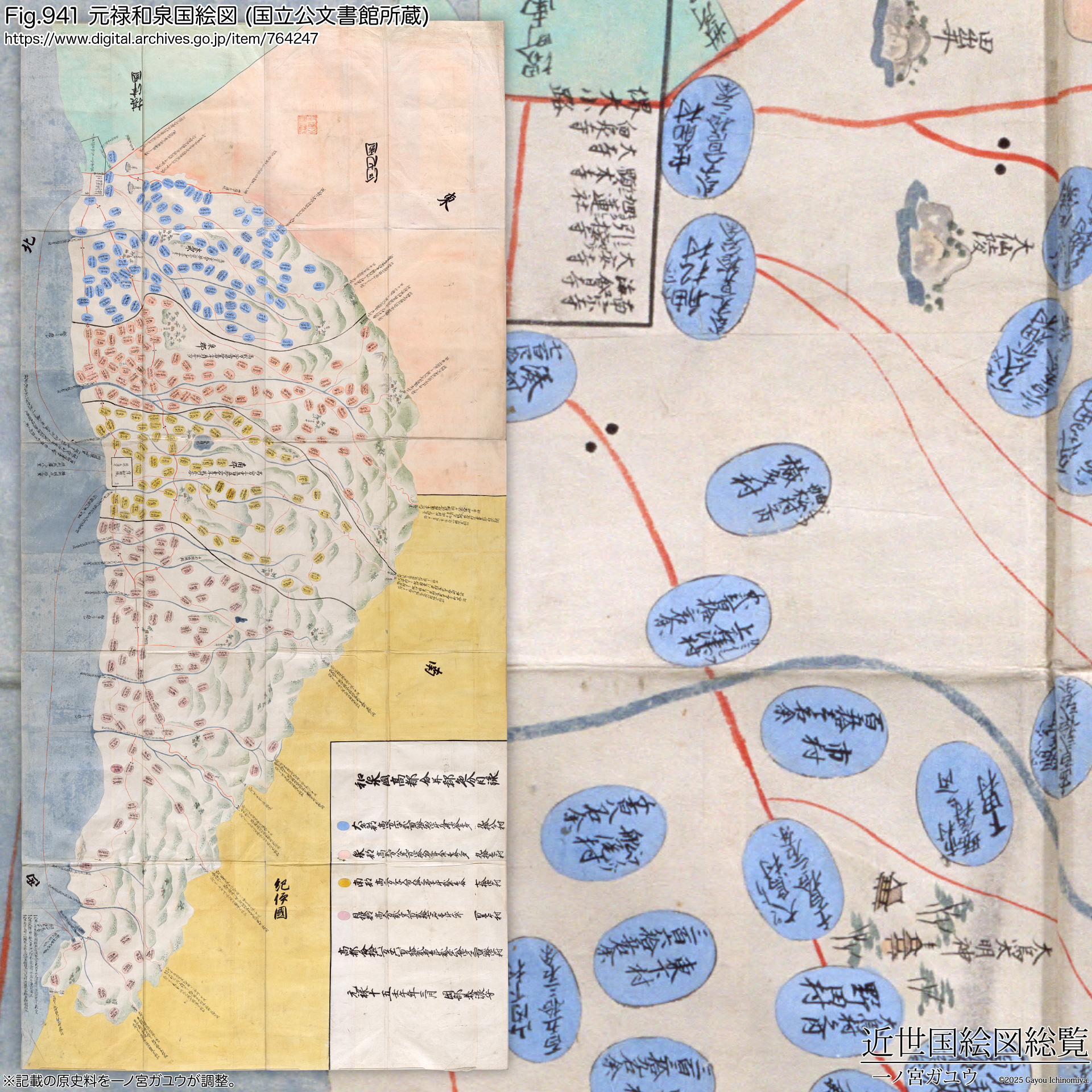 『元禄和泉国絵図』(#764247) は写本のひとつである。山城国などと同様に和泉国の場合も比較するものがないが、背景の自然描写で山陵と森林の多くが省略されているとみられる。大きさは 東西 137cm × 南北 295cm、元禄15年(1702) 3月の日付 (『元禄十五壬午年三月』) と、岡部美濃守の名前が記されている。
