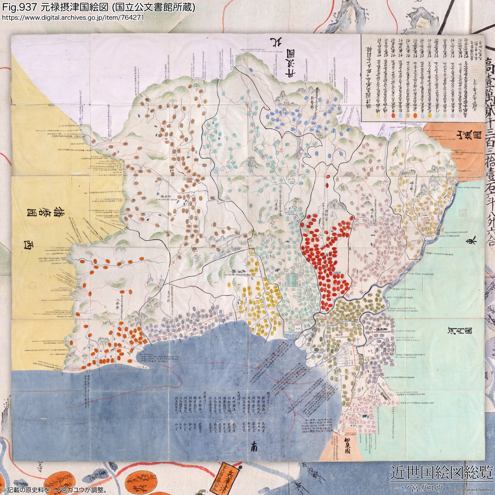 『元禄摂津国絵図』(#764271) は写本のひとつである。摂津国の場合は比較するものがないが、『元禄近江国絵図』の例から、背景の自然描写では山陵と森林の多くが省略されているとみられる。実際『天保摂津国絵図』と比較するとその数は少ない。大きさは東西 274cm × 南北 246cm、元禄15年(1702) 2月の日付 (『元禄十五壬午年二月』) と青山播磨守・永井豊熊・九鬼大和守の名前がある。