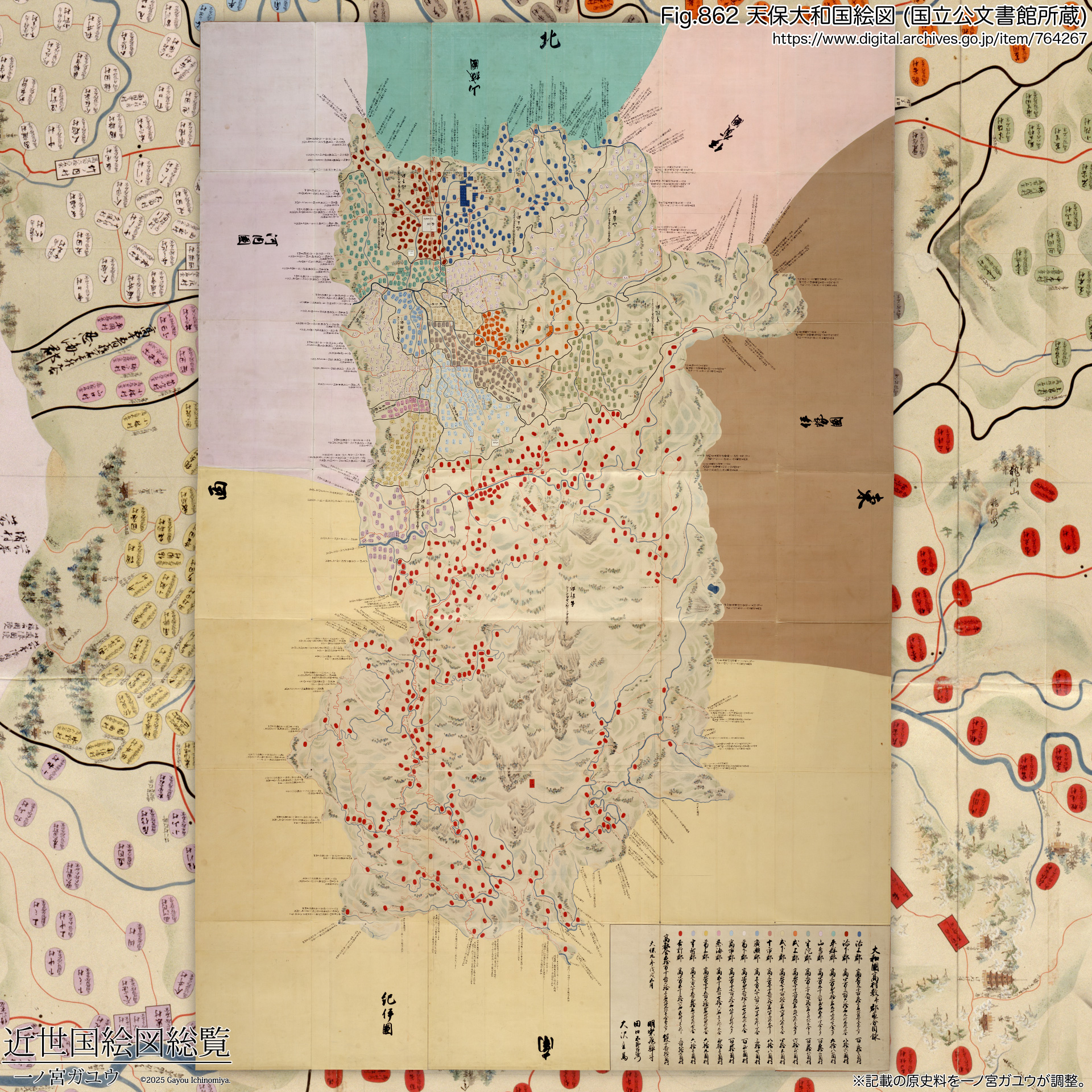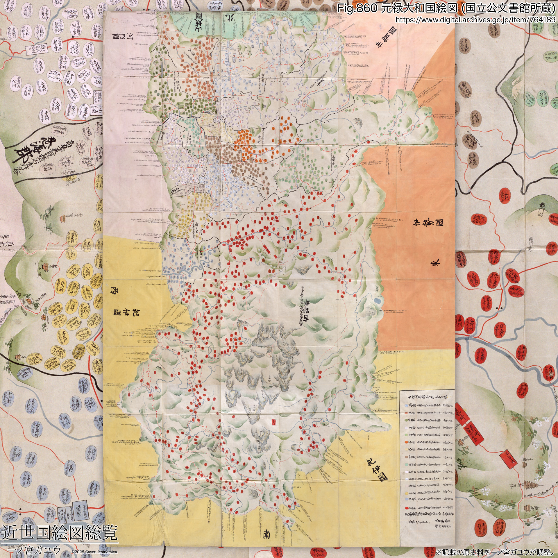大和国絵図については『江戸幕府撰大和国絵図の現存状況と管見した図の正確について』(礒永、『奈良県立民族博物館紀要 第16巻』(1999)※1) に詳しい。