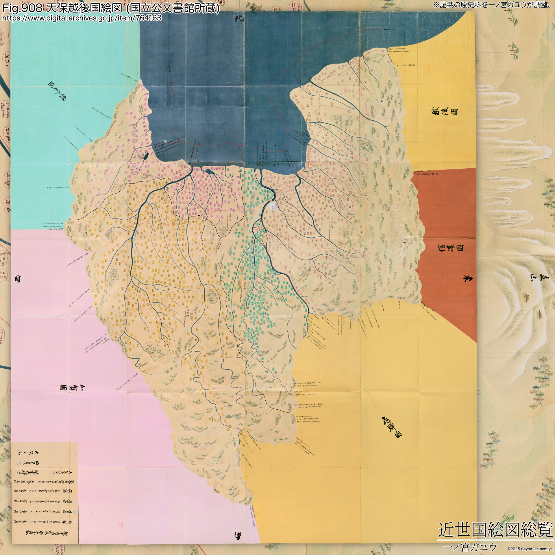 『天保越中国絵図』は東西 448cm × 南北 502cm、目録の奥書部分には、全国一律に天保9年(1838) の日付 (『天保9年戊戌五月』) と明楽飛騨守・田口五郎左衛門・大沢主馬の名前が記されている。天保国絵図一般については『9. 天保国絵図』を参照のこと。