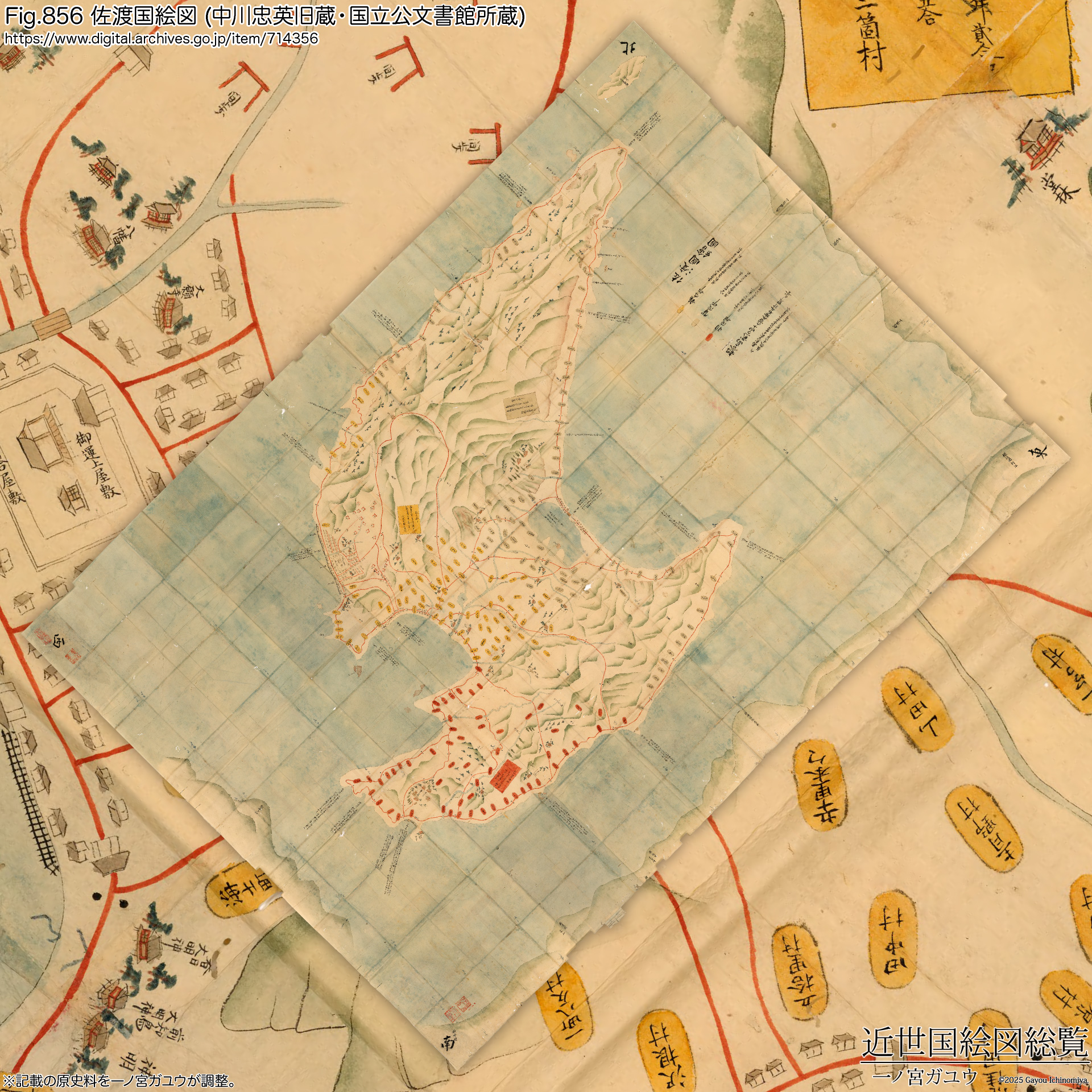 新潟県立歴史博物館には『佐州全図』が現存し、オンライン公開されている。画像データとしては 1,293 × 1,200ピクセルで、jmapps.ne.jpドメインで御馴染の拡大する機能を備えたビューアが提供されている※1。当然ながら外観を確認できるだけである。