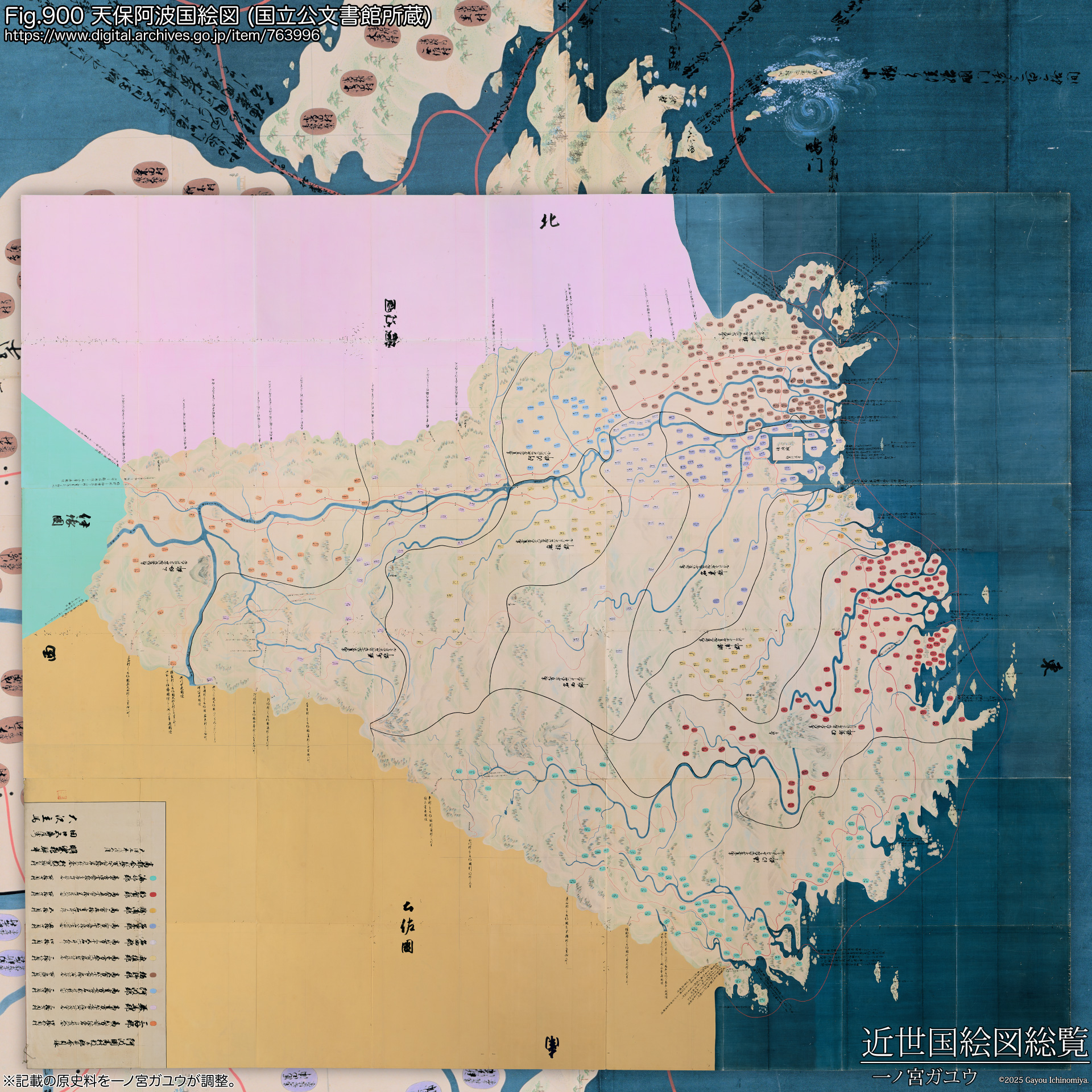 | 天保 | 筆者 | 阿波御国図 (#1 #2 #3 #4 #5 #6 #7) | 収蔵歴史アーカイブス データベース (国文学研究資料館所蔵) | [下] 元禄国絵図の7分割の写しに重ねて変更内容を描いた薄紙 (懸紙) か、それに基づく下絵図と推定される。 | ||