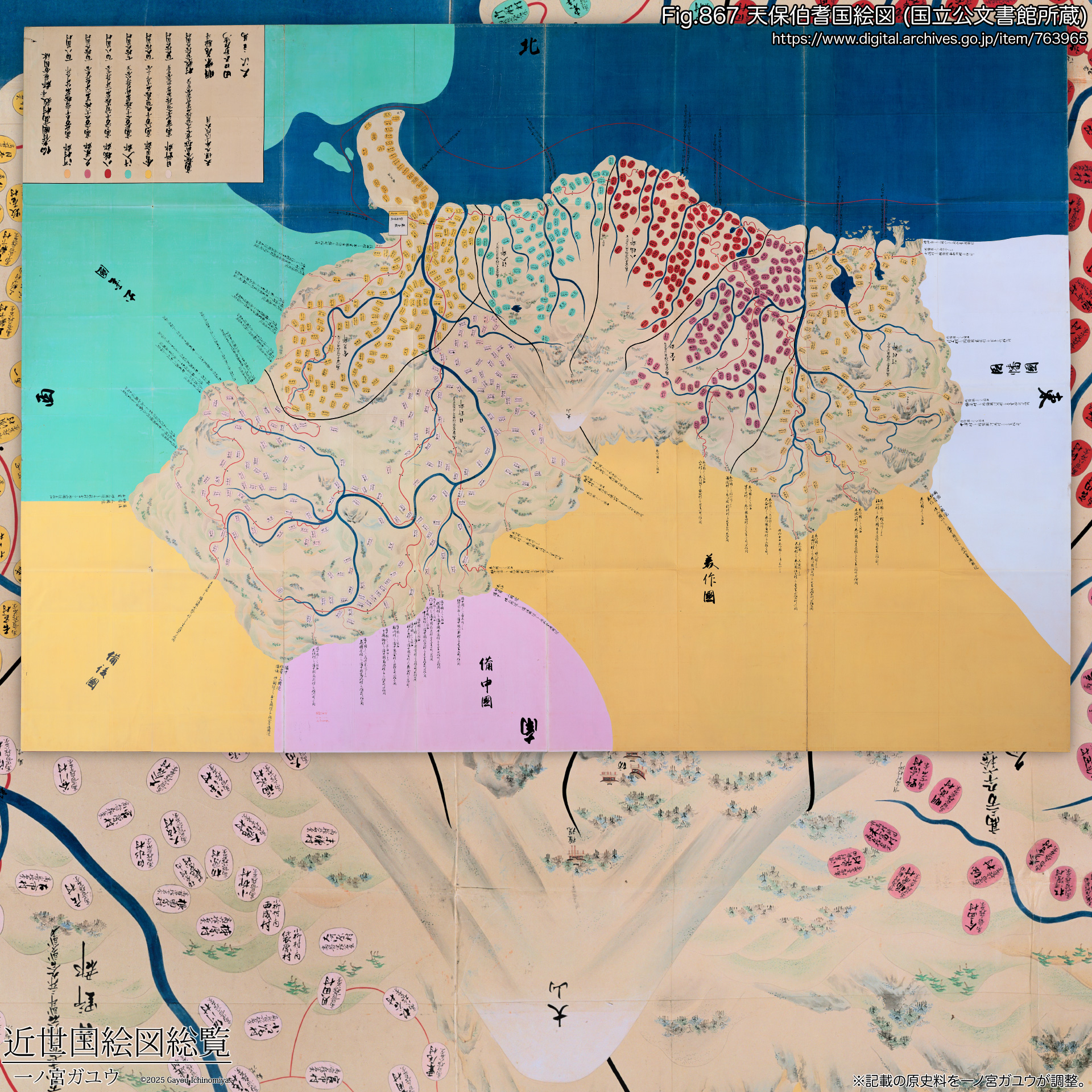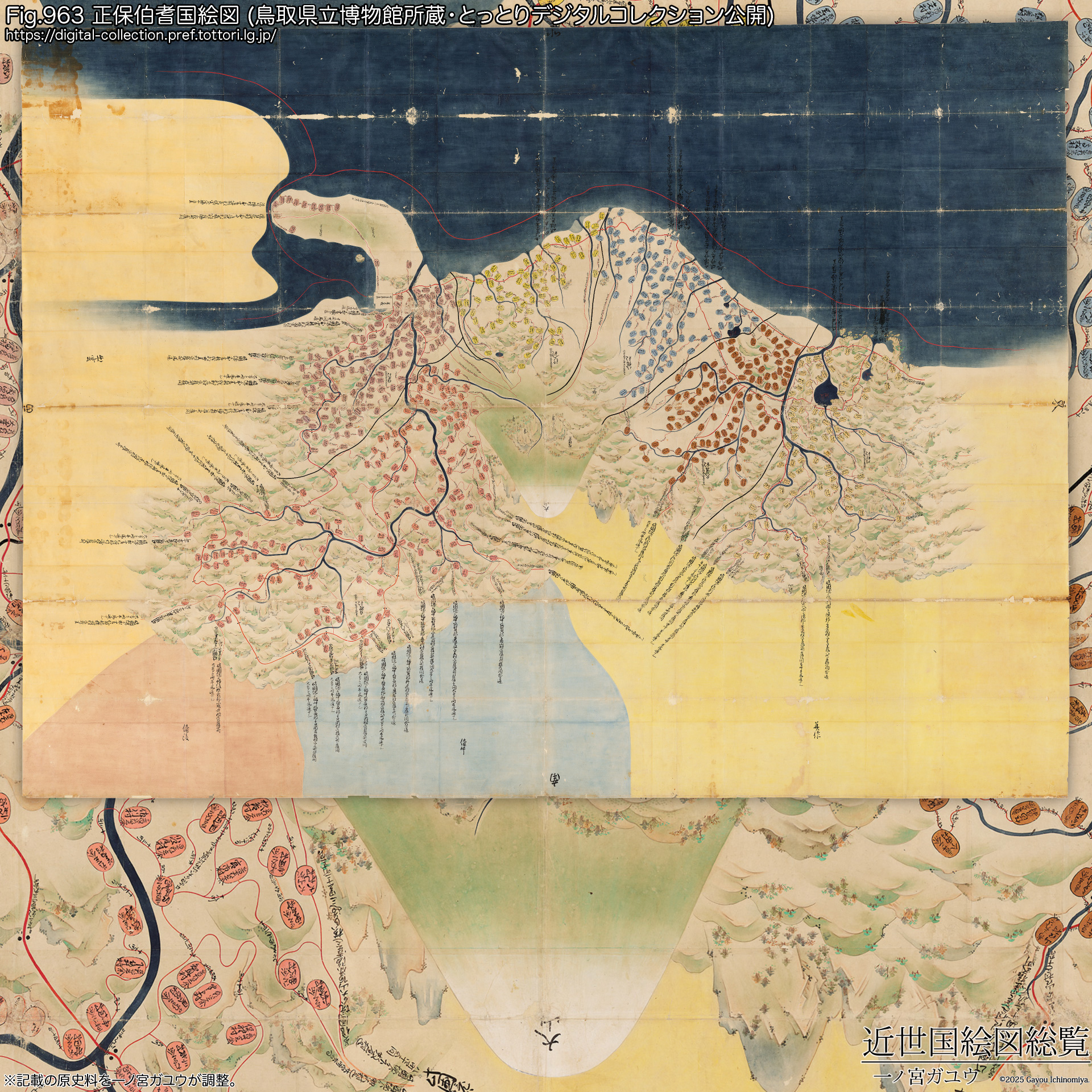 以上のように本図の各郡高は、元和3年(1617) 池田光政が鳥取藩に移った時点の公称の国高 (『拝領高』) や、いわゆる「寛文印知」の寛文4年(1664) 『池田光仲宛領知判物・目録』の各郡高に整合する。