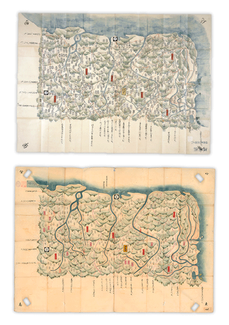 一方で、城下を街並みまで周囲の縮尺を無視して大きく描くことや、朱線で引かれた街道に道程記載があって、本図の延長に正保国絵図を想像することができることは、本図が寛永国絵図である可能性を示唆している。