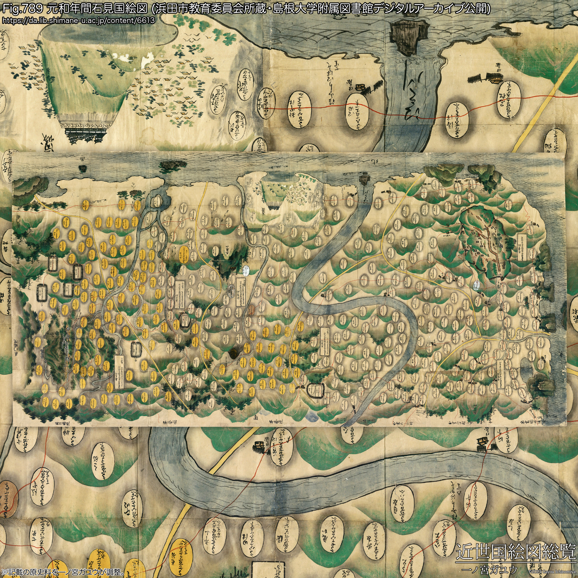 浜田郷土資料館に現存する『元和年間石見国絵図 (紙本著色石見国絵図)』は、名称にあるように元和3~5年(1617~1619) ごろの作成と推定されている国絵図で、島根大学附属図書館でオンライン公開されている。