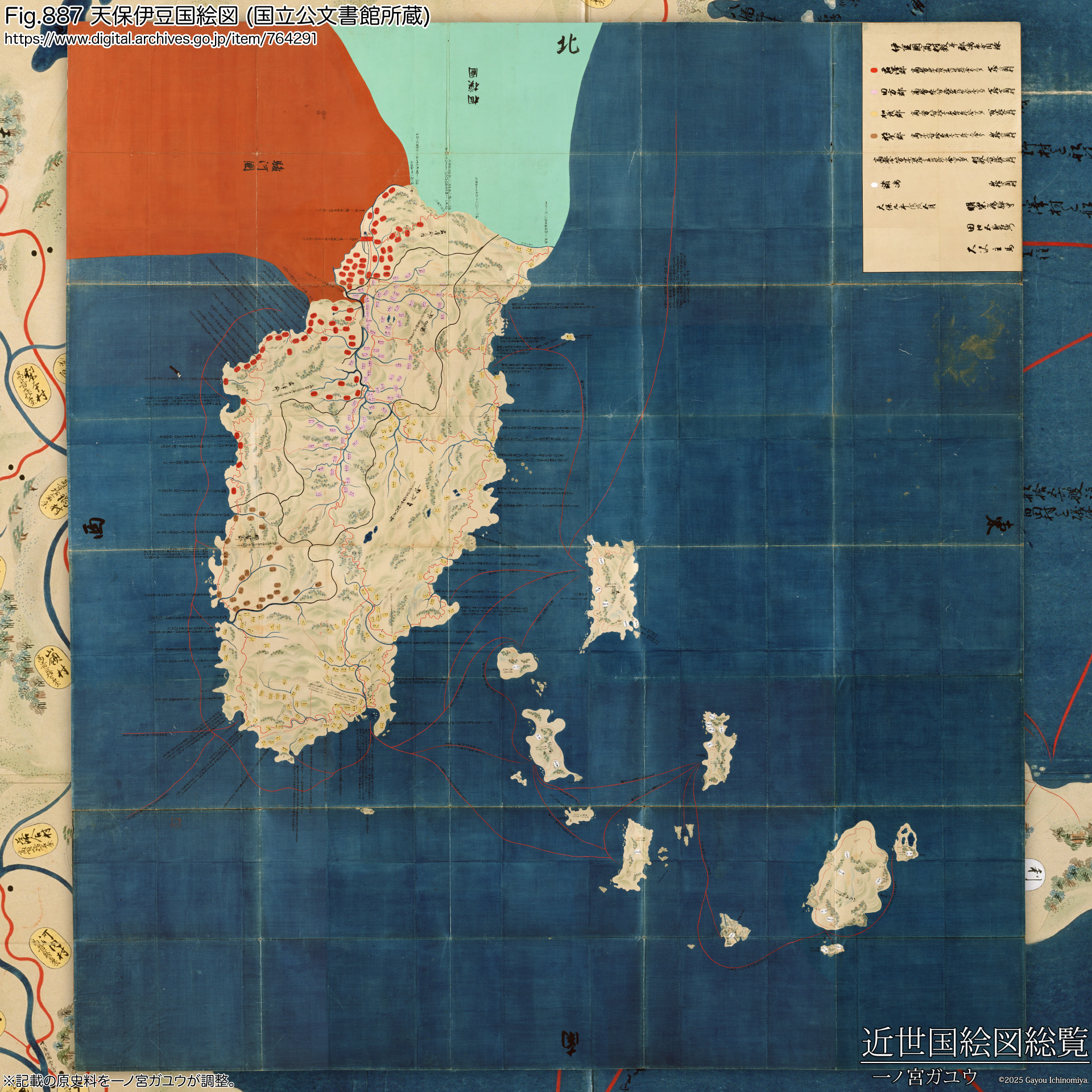 ↓一覧へ移動伊豆国 (豆州) は東海道に属する国である。国立公文書館所蔵の『天保伊豆国絵図』は紅葉山文庫旧蔵・勘定所旧蔵の両方が現存し、紅葉山文庫旧蔵 (#764291) がオンライン公開されている。