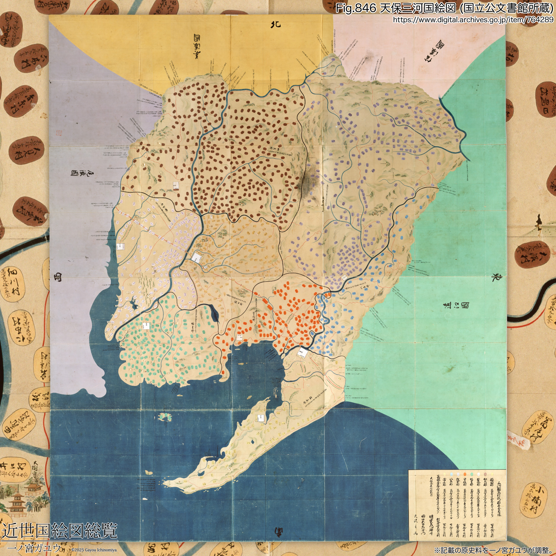 冒頭で言及のとおり、『天保三河国絵図』は国立公文書館に紅葉山文庫旧蔵 (#764289) が現存・オンライン公開されている。