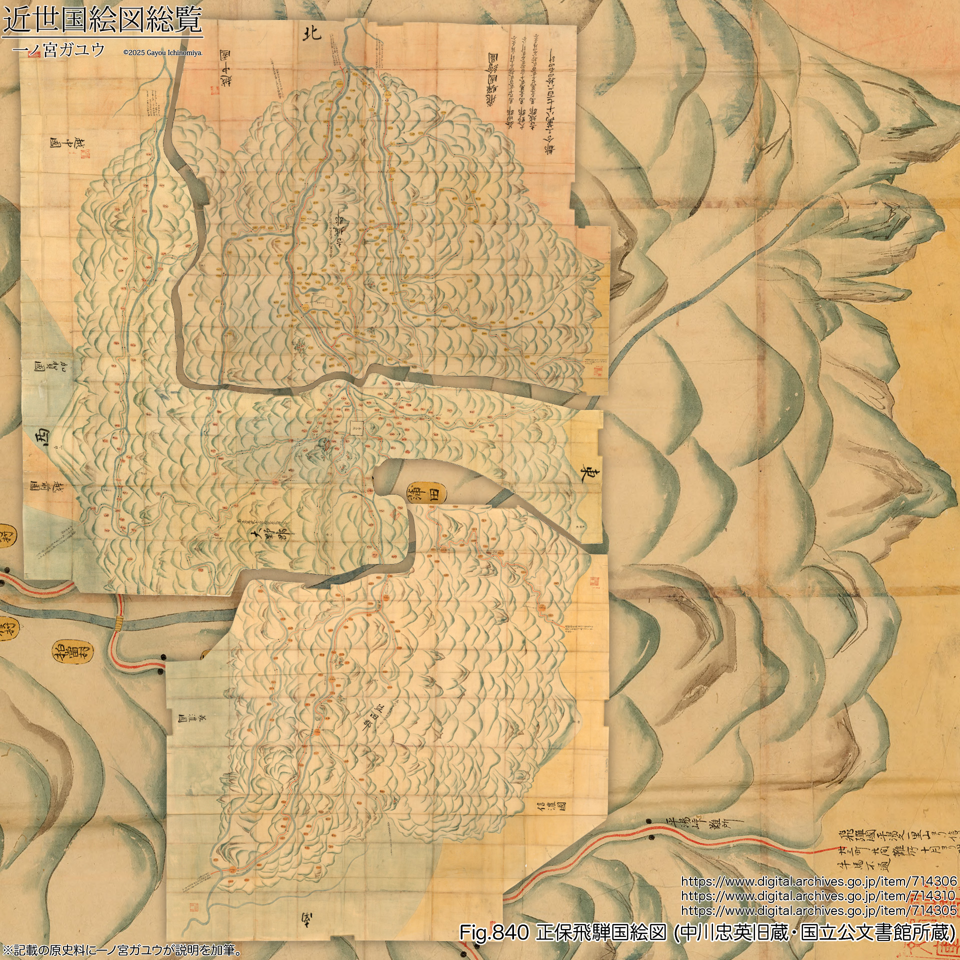 国立公文書館所蔵、中川忠英旧蔵の国絵図群 (通称『日本分国図』) には飛騨国のものが 3分割された形式で含まれ、すべて現存・オンライン公開されている (#714305 #714306